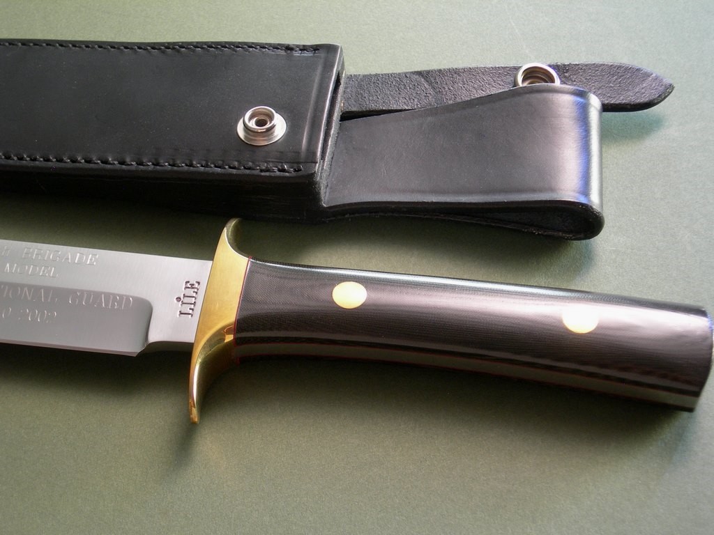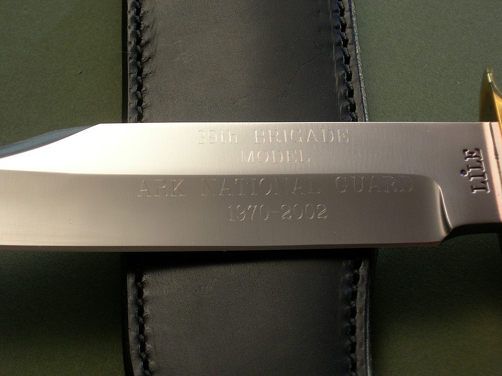 6 photos for review – as shown, a new brown canvas carry case is included. This is a very collectible 39th Brigade Bowie in exceptional condition, a must have for any Lile Bowie Knife collector. Very rare to find with the ARK National Guard blade script, I can't remember ever seeing another like it. Much info below courtesy of the Wikipedia website, while I have not looked specifically I’m relatively certain this model is also mentioned in the Lile book. Check it out... thanks and good luck.