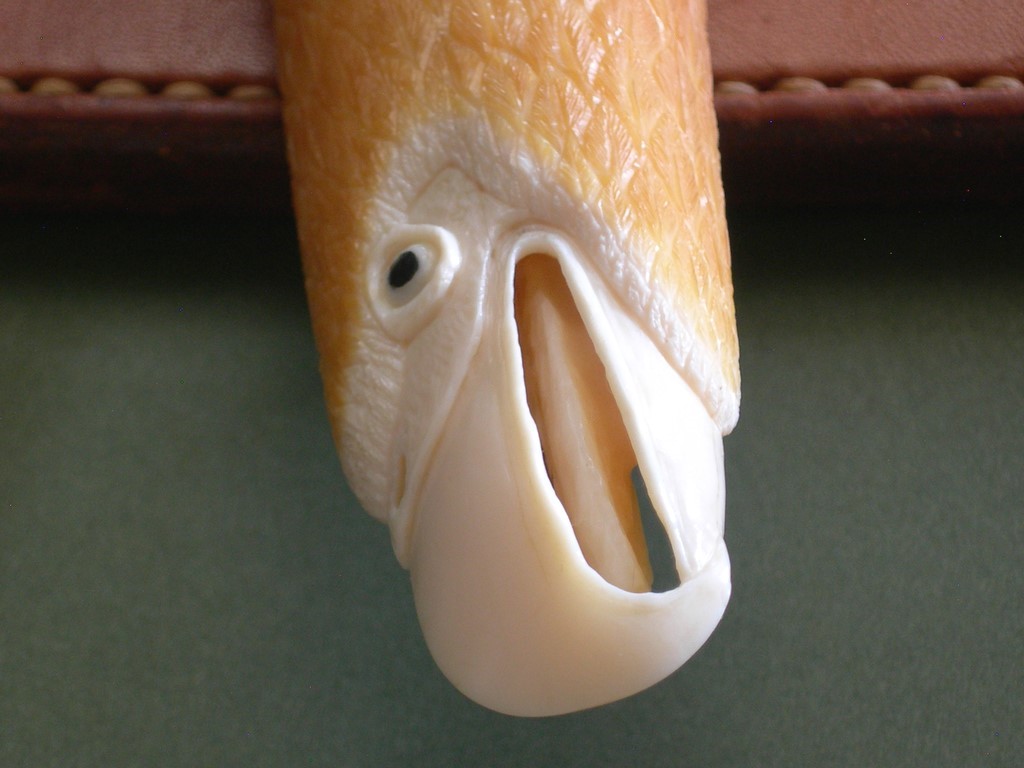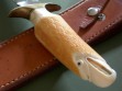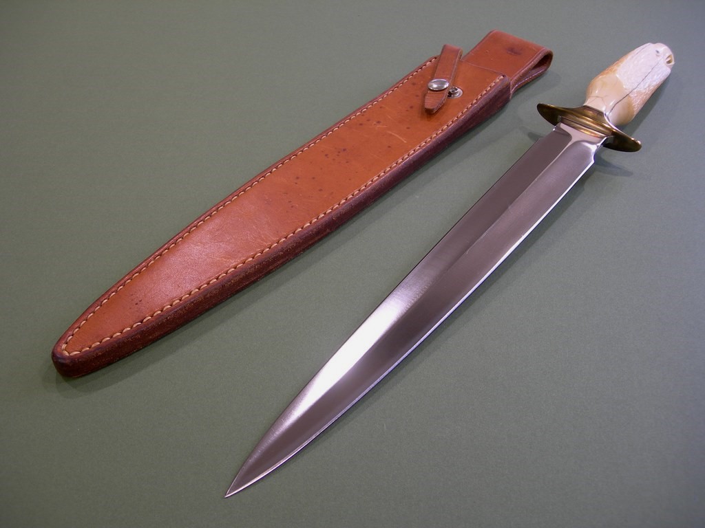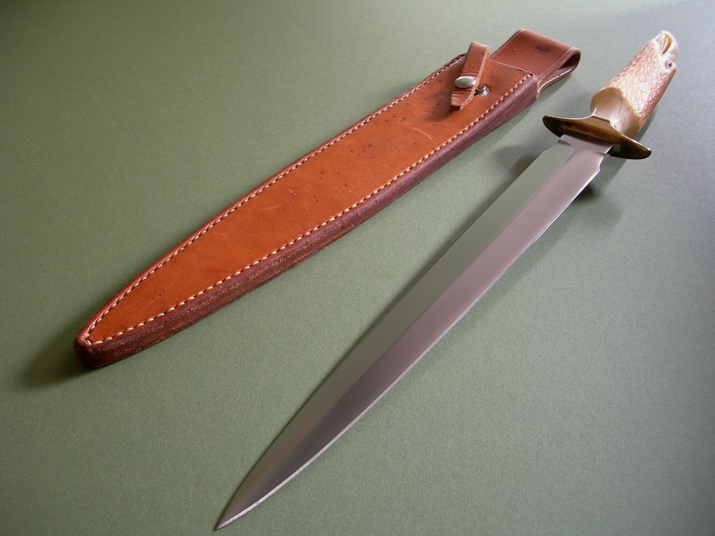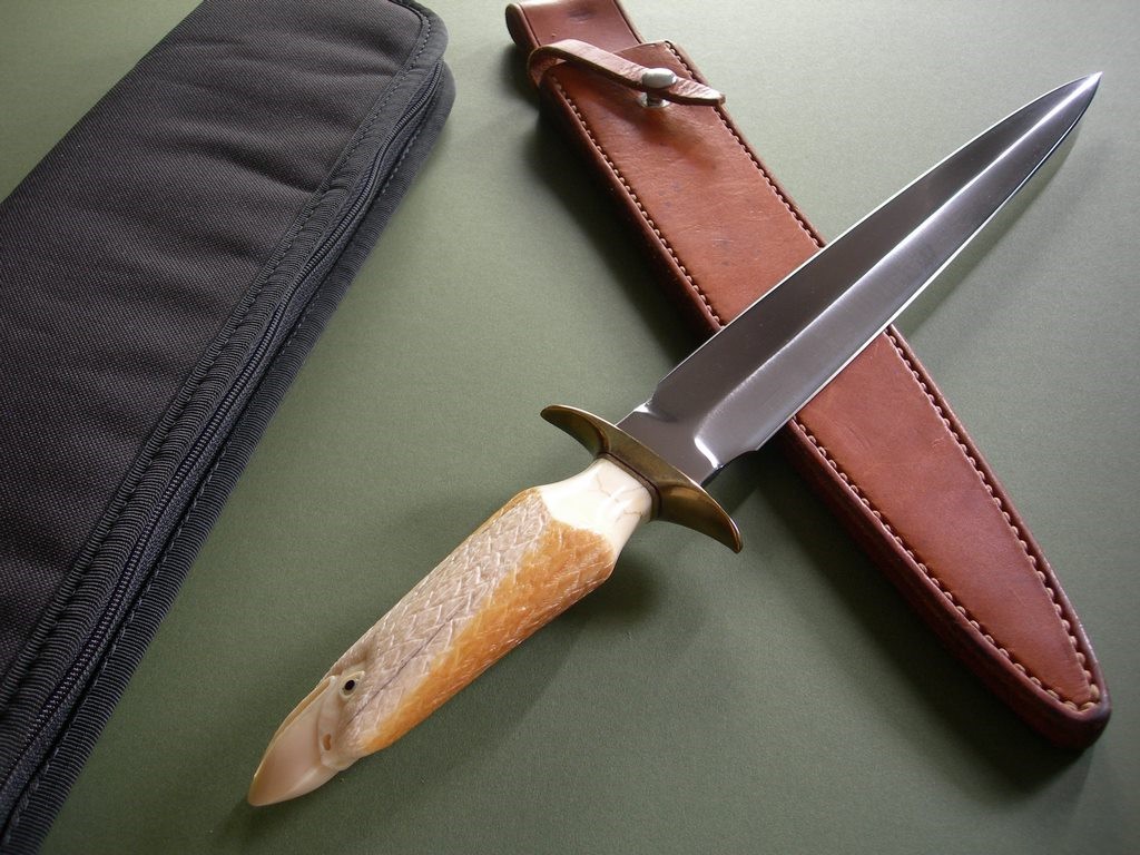 Summary: another amazing highly collectible script signed Lile knife. This 12” Arkansas Toothpick is SO cool… condition is excellent or better with nothing but checks / hairline cracks in the hand carved pre-ban handle. I’m assuming the late James Stewart (RIP) carved the handle, it’s gorgeous with amazing detail.