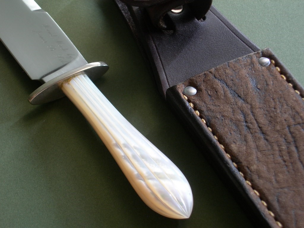 The 6" script signed blade with original blade looks perfect, Jimmy handled it with an old / vintage pearl carving fork handle. It left the shop this way, was confirmed by J.W. way back in the day when she was still alive. (RIP)
