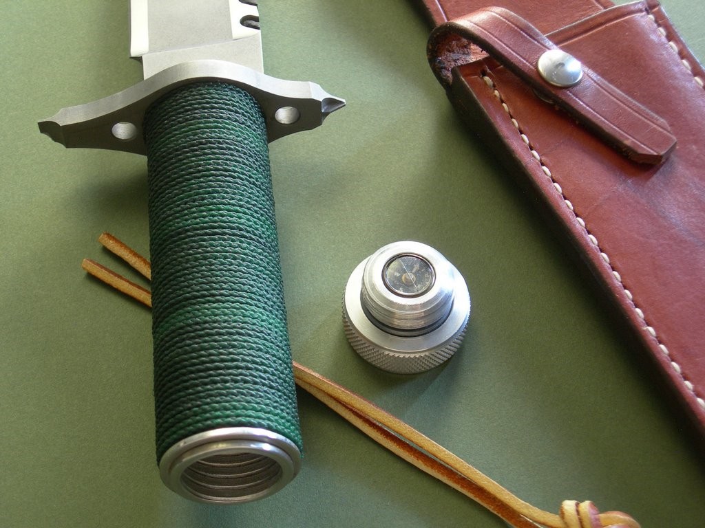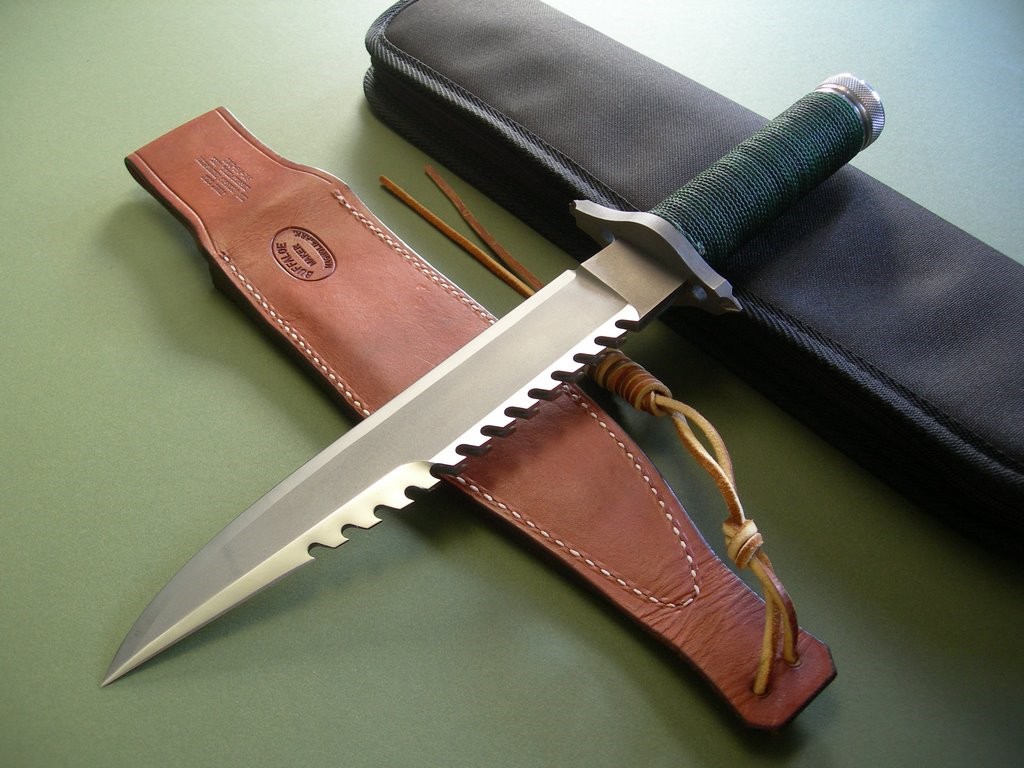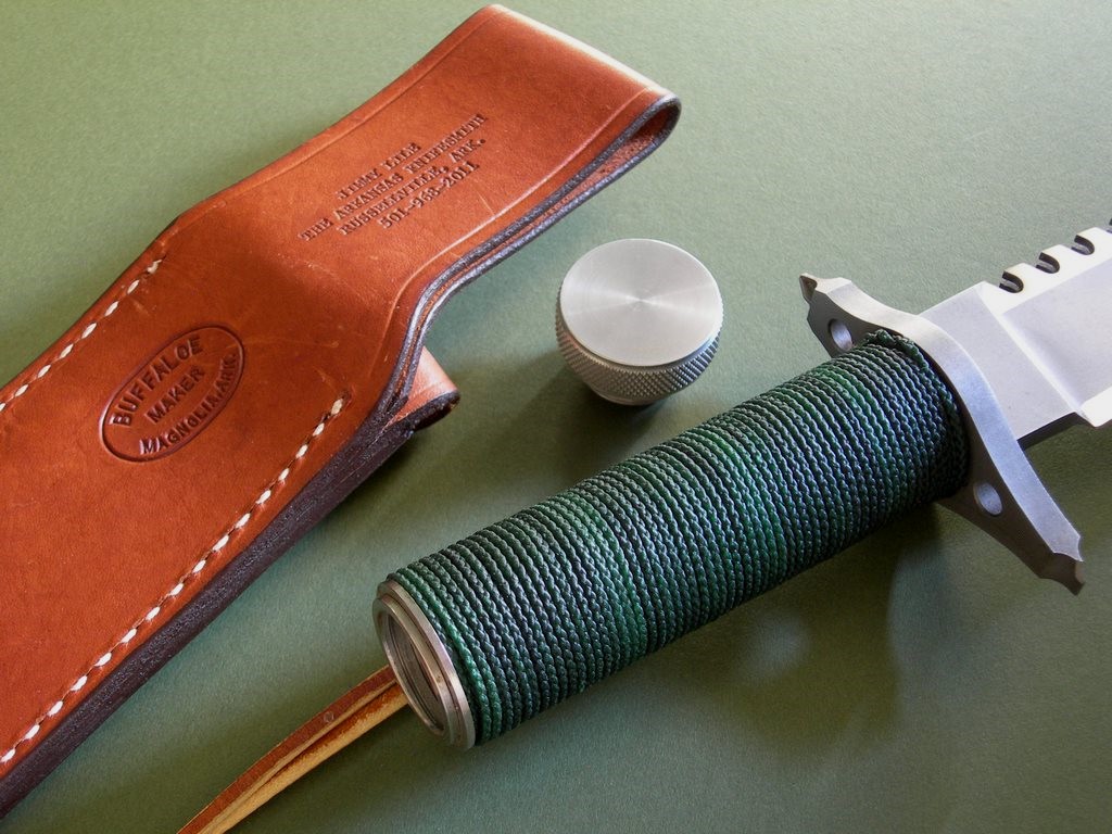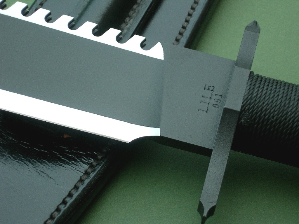 Summary: Jimmy Lile First Blood #91 and original Buffaloe no hone sheath. The knife is unused with original edges, original handle wrap in excellent condition. Flat butt cap with compass that works, overall condition easily excellent+++. Photos are accurate, this knife is in amazing condition.