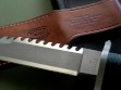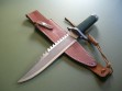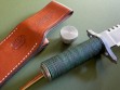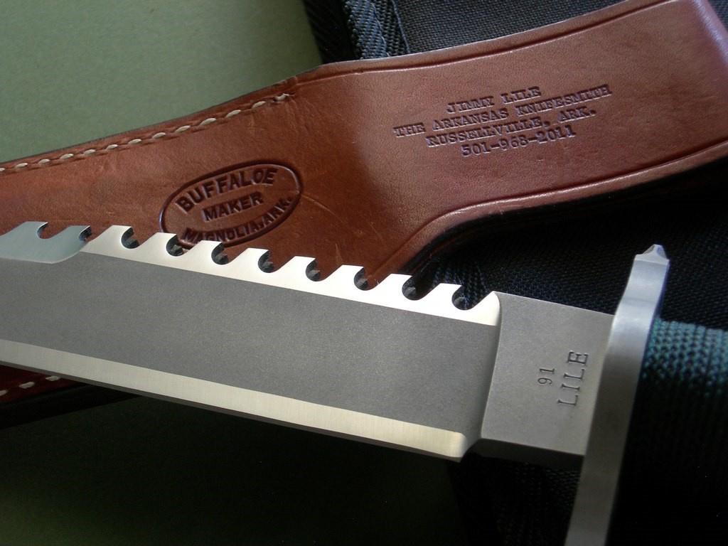 The Buffaloe sheath has handling marks front and back, quite common for a sheath more than 40 years old. Buffaloe and Lile shop stamps on the back, the normal scuffs in the leather at the throat from knife insertion.