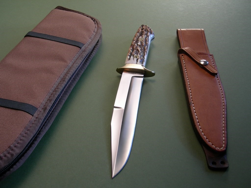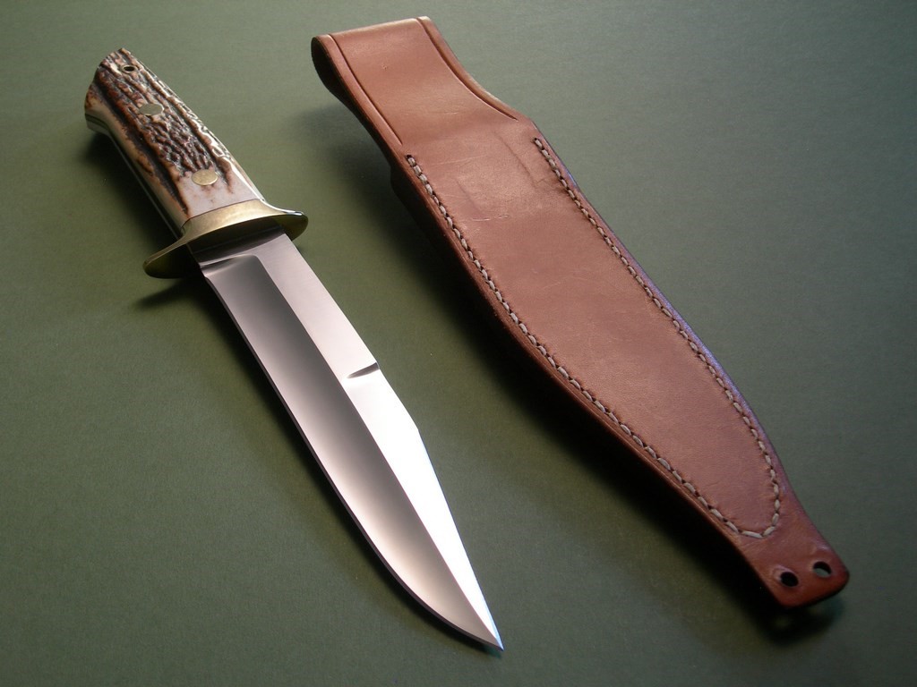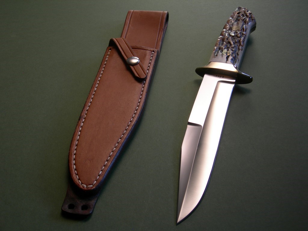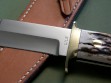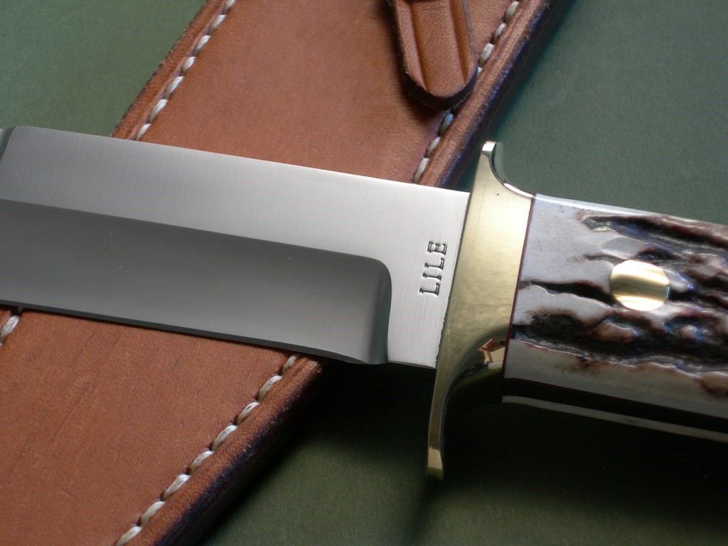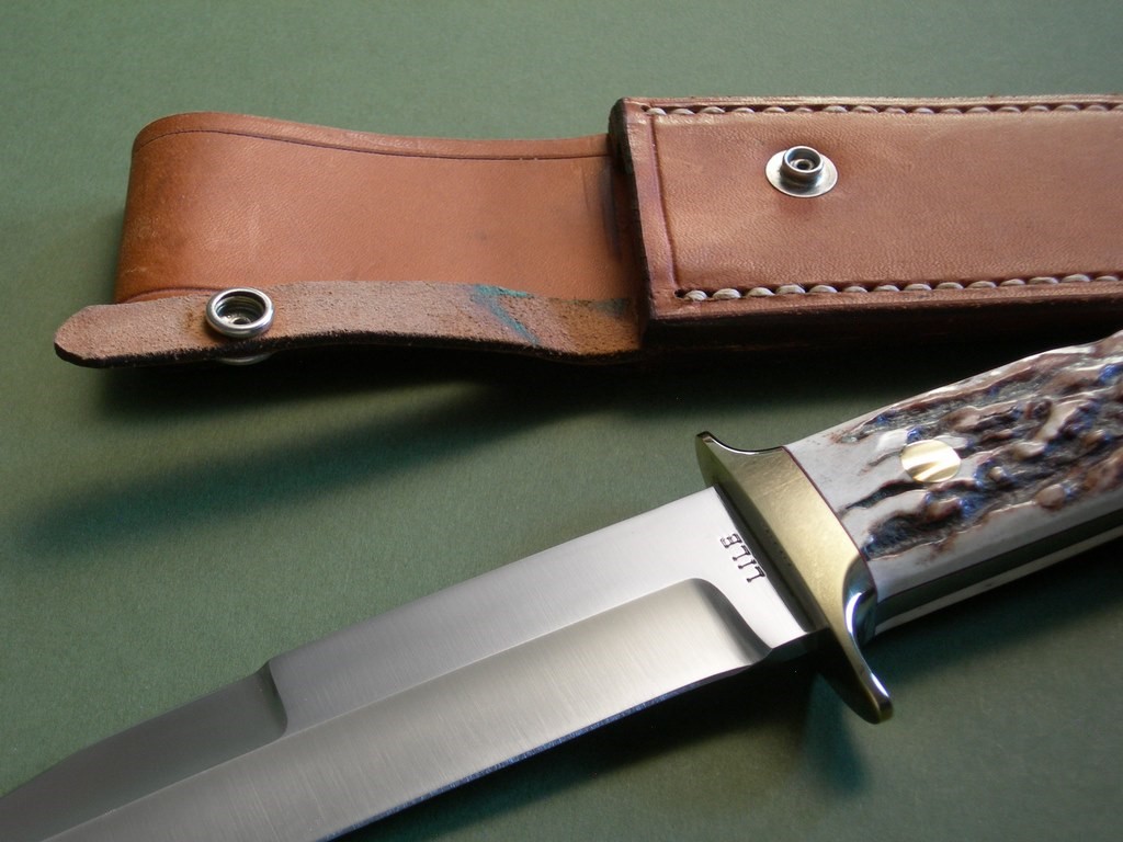 Summary: this is a Lile Fighting / Combat Knife made around 1978. The blade is 7" long with LILE stamp -- the upper clip is sharpened back approx. 2-3/4". The knife is fitted with a double brass hilt, brass pins and stag slabs – overall length is exactly 12”. As far as Lile fighters go, this is an absolutely primo example. It's one of the nicest you'll find, near mint condition with nothing but VERY light fondling marks on the brass hardware.