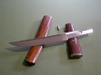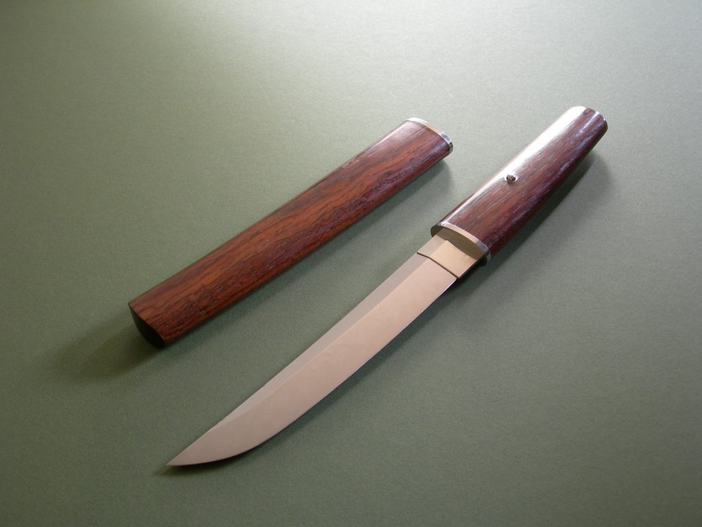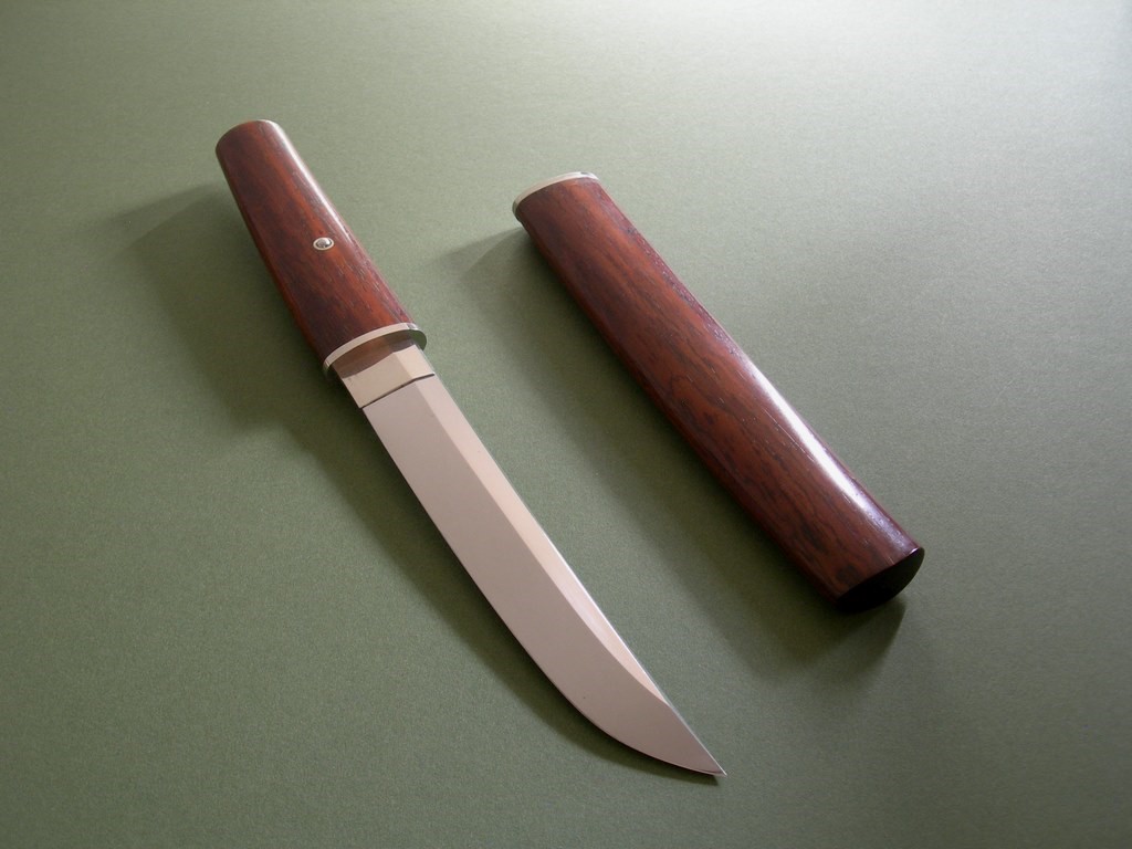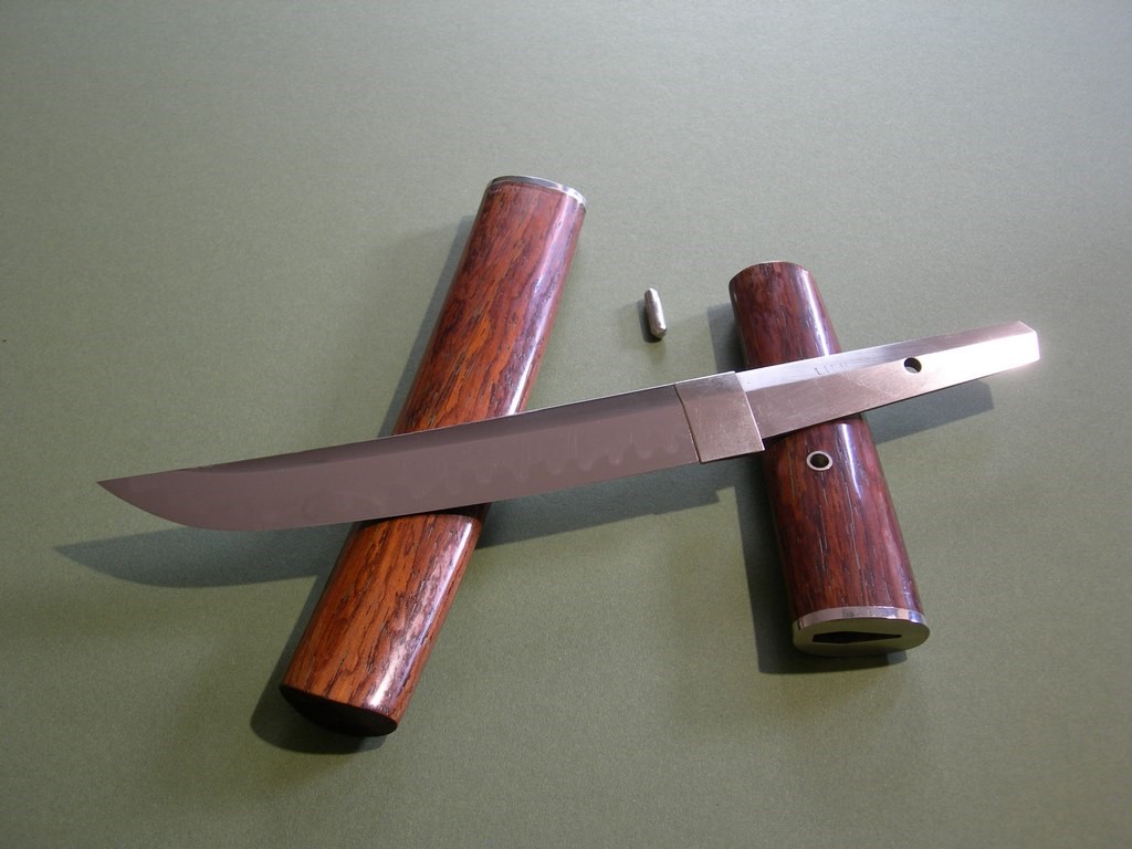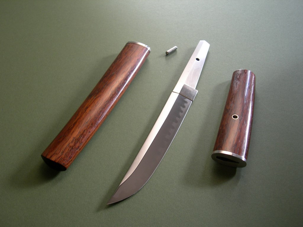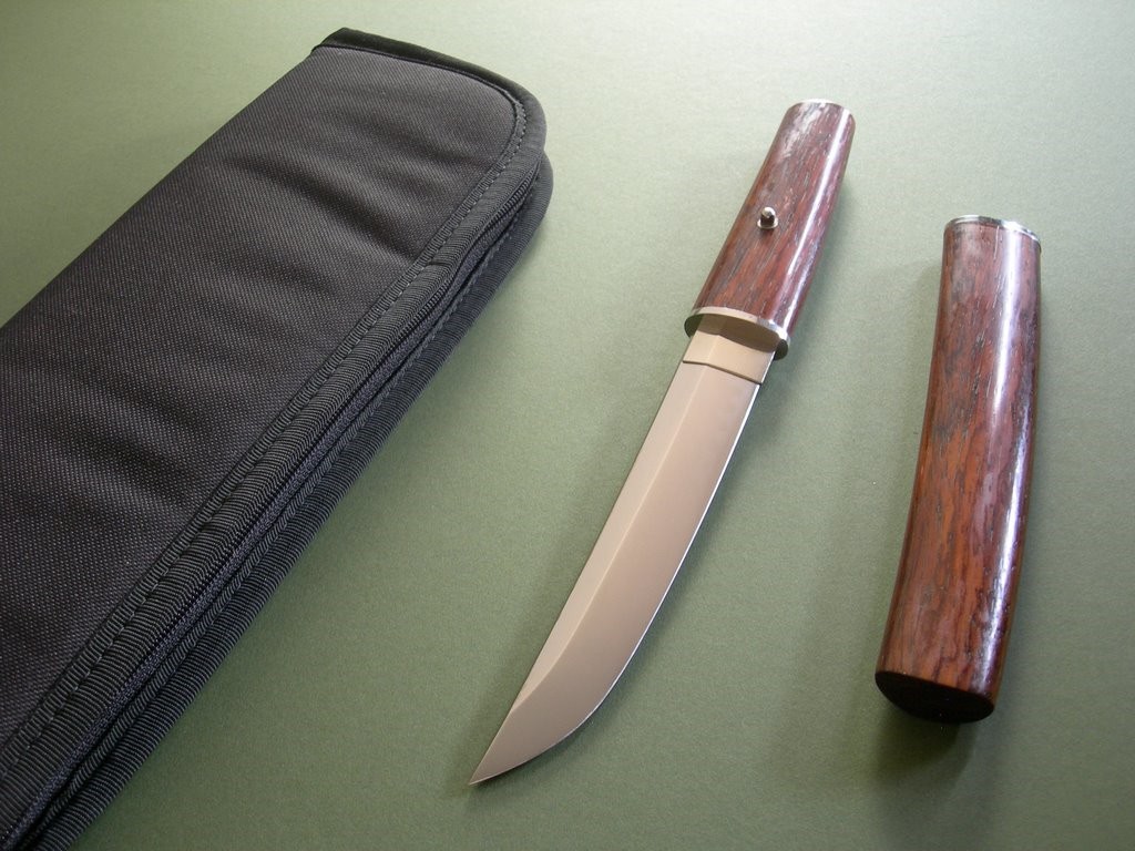 This knife has a 6-1/4” mirror polished blade with very visible hamon, overall length is 11-3/8”. Condition is near mint, nothing but a few light handling marks at most. Pin through the wood handle that comes out to remove the handle, it’s tight and I only removed it so I could photograph the tang stampings. The original wood scabbard fits perfectly, all said and done a gorgeous, rare, unique and collectible Lile knife!!