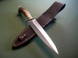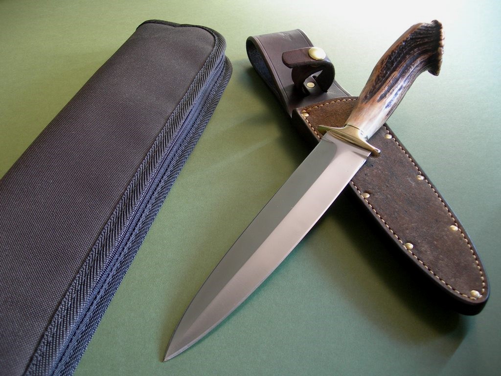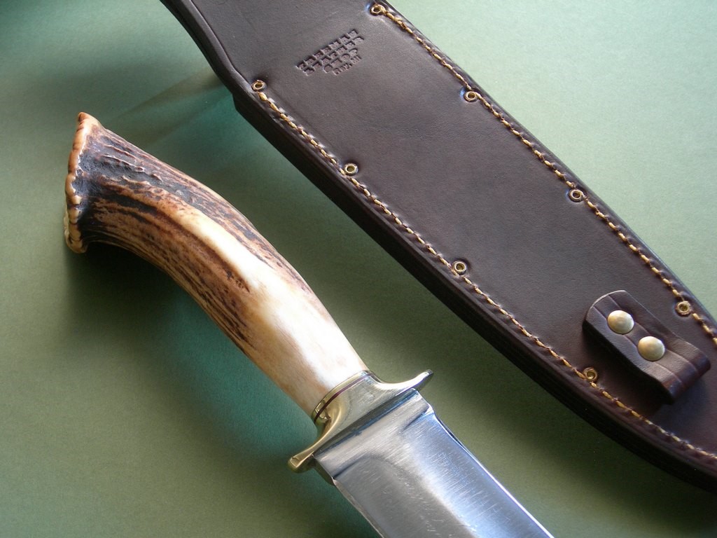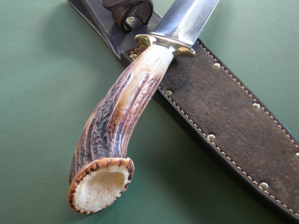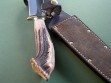 This knife has an 8” double edged blade, brass guard, maroon / red spacers and above mentioned crown stag. Gorgeous knife, excellent condition with original edges. Blade width at the guard is 1-1/2”, 14-1/4’ overall.