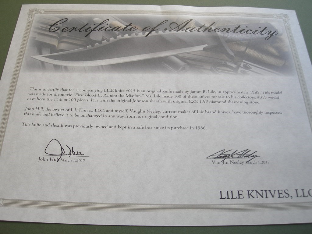 C.O.A. from Lile Knives, I think they sold the knife for Marilyn Lile back in 2017.