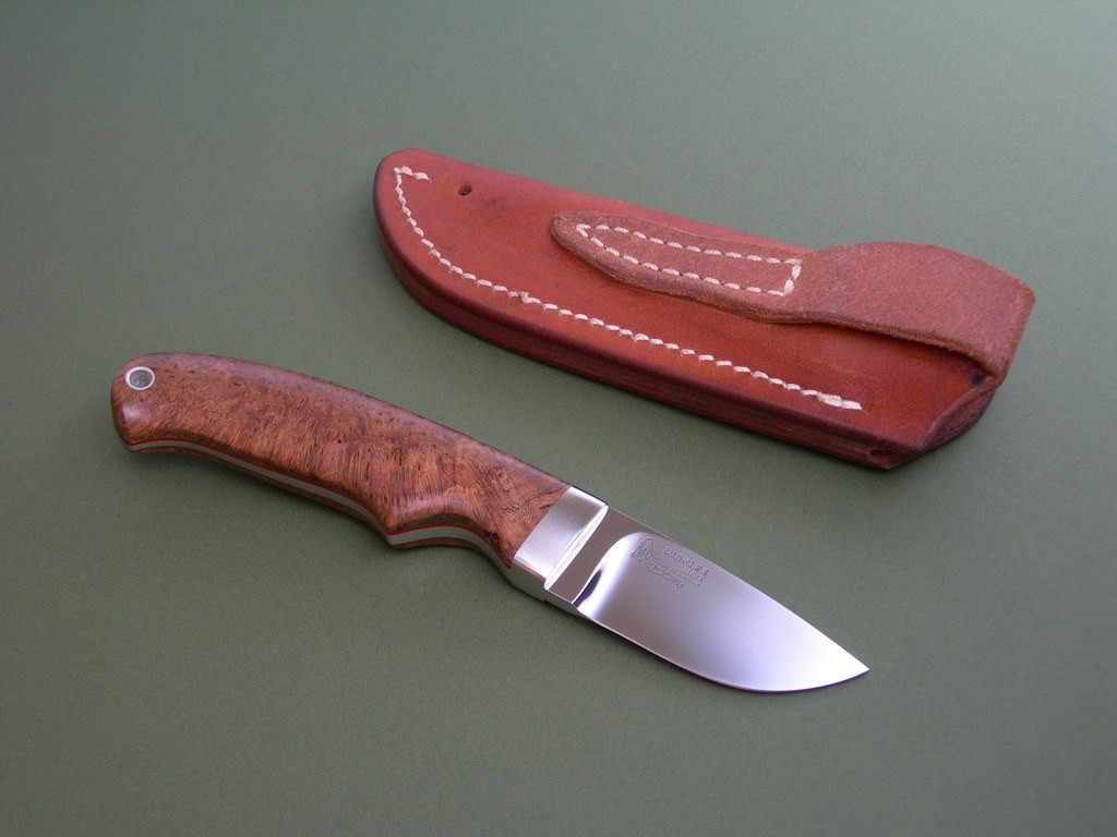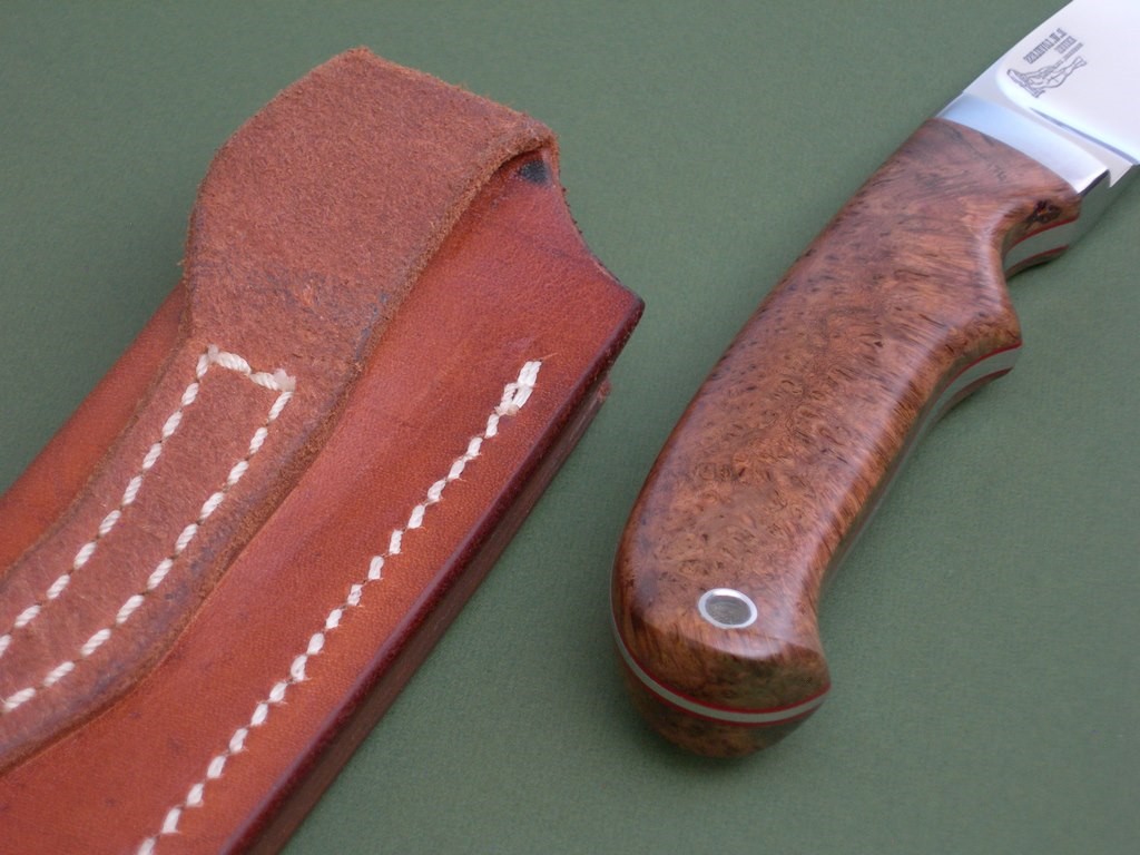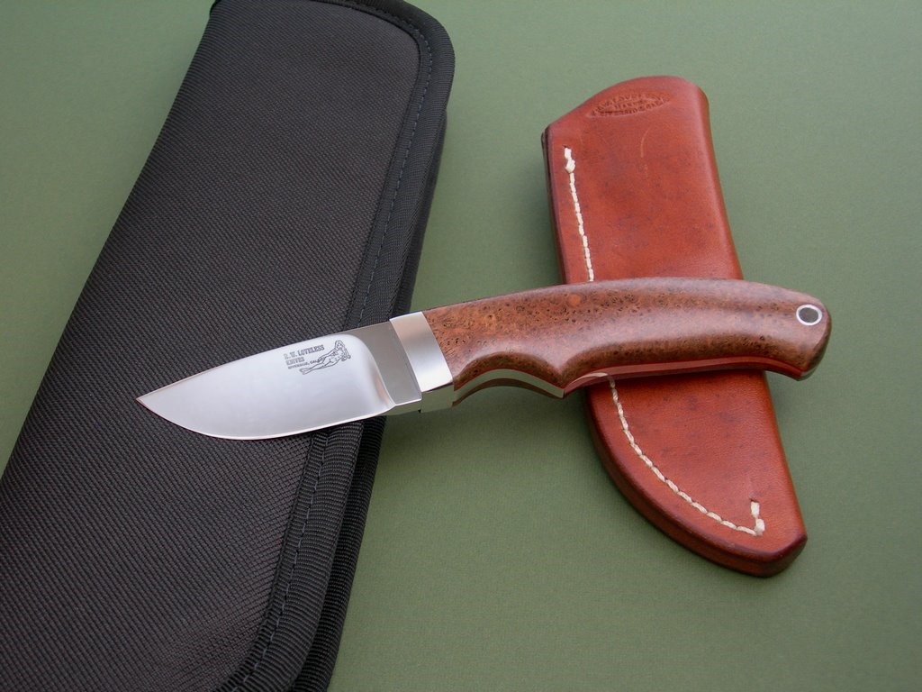 Summary: a drop dead gorgeous Merritt-made R.W. Loveless Knives "Randall" hunter. This knife has a 2-1/2" drop point stainless blade, brushed stainless steel guard, and beautiful burlwood slabs. This knife bears the coveted "double naked lady" blade etchings, it is unused with original blade edge and in mint condition.