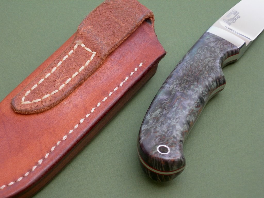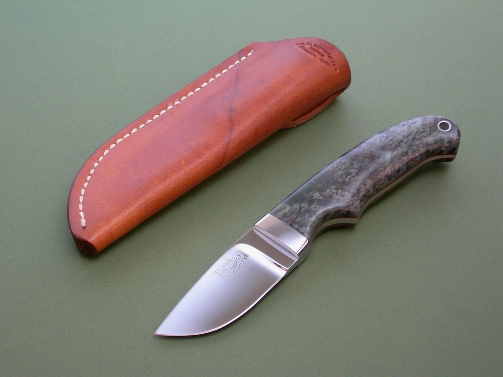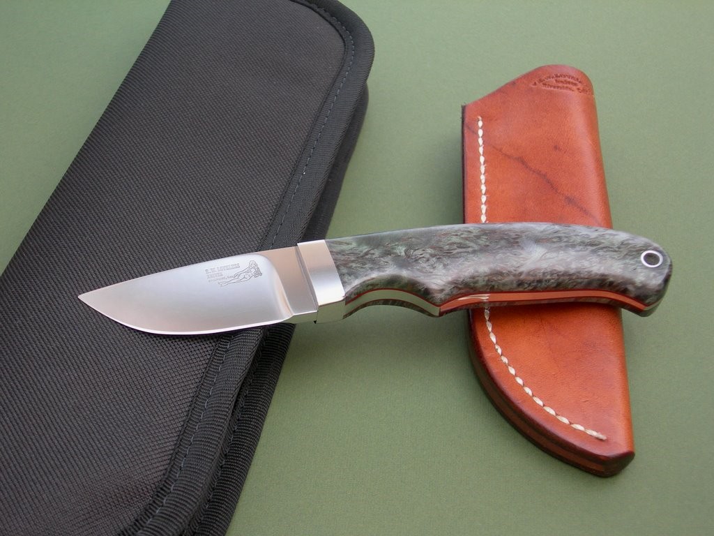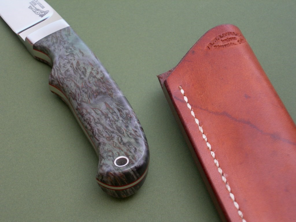 Summary: a drop dead gorgeous Merritt-made R.W. Loveless Knives "Randall" hunter. This knife has a 2-1/2" drop point stainless blade, brushed stainless steel guard, and beautiful dyed Maple slabs. This knife bears the coveted "double naked lady" blade etchings, it is unused with original blade edge and in mint condition.