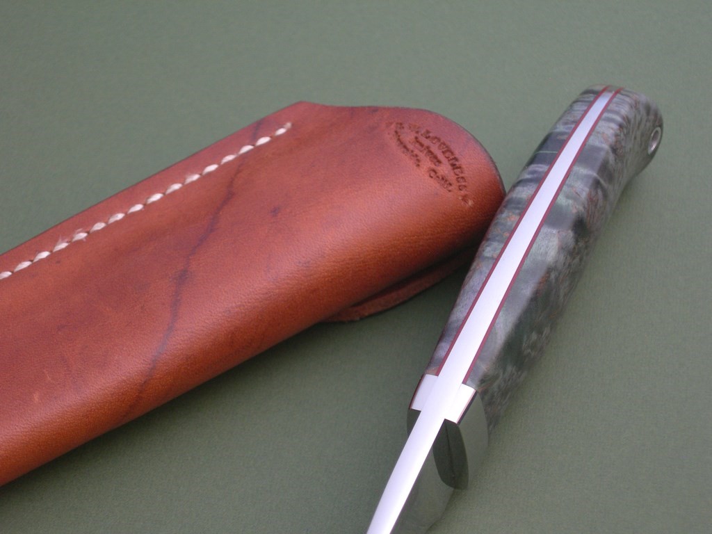 The sheath is original to the knife, brand new with the R.W. Loveless Knives stamping at the top edge near the throat. The sheath is "as new”... near mint with just a couple of very small handling / scuff marks.
