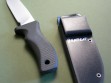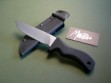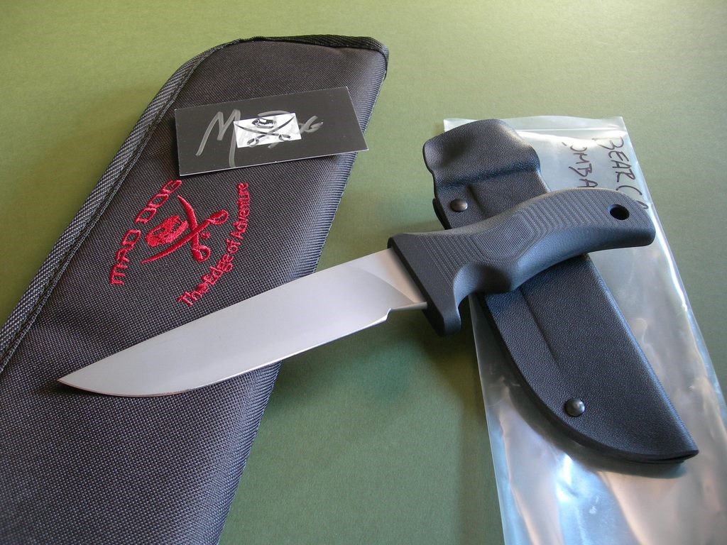 This is a Mad Dog Knives Bear Cat, an awesome EDC with combat finish 5-1/2” blade. Made from 3/16" stock -- this is an extremely good looking and durable knife in stock and ready to rock. The black handle material is compression bonded to the hidden full tang and incredibly ergonomic. Light in hand, overall length is hair over 10”. Mad Dog trademark on the blade – this knife is brand new and in mint condition.