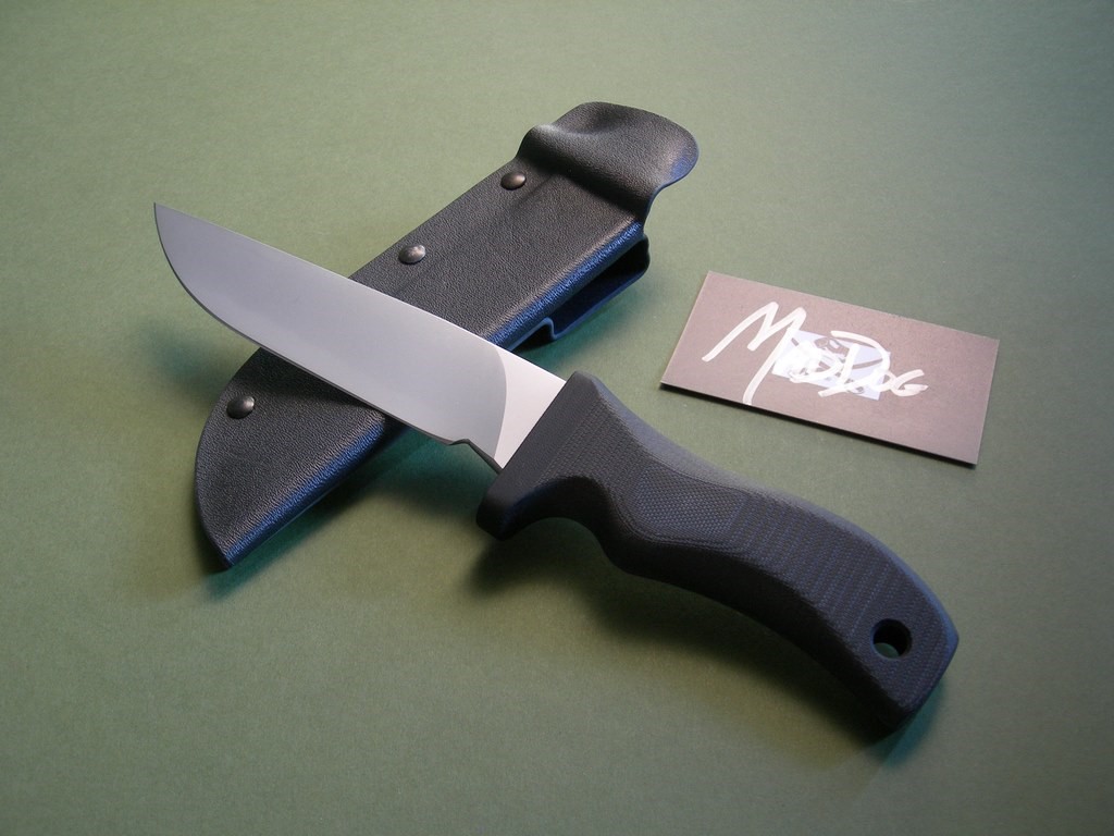 The basics: All current MD knives are variations on a theme. Selectively tempered O-1, hard-chromed, with a composite grip. The cutting edge comes in at around 62 Rockwell hardness, while the spine is in the low 50's. McClung, in my opinion, has found a combination of materials, construction methods, and style that he has mastered. He has cracked the code, so to speak. The only nod to cosmetics are the occasional non-black colored grips and either the VVTL (very visible temper line) or the GTL (glowing temper line). The VVTL and GTL visually enhance the blade, but the blades are still hard chromed. I recently read a quote which said that perfection is achieved, not when there is nothing to add, but when there is nothing to take away. Mad Dog knives are certainly that. Knives which are built to be used and which are esthetically pleasing because they have been engineered and tweaked over time to provide the highest level of performance available. They are not purposely embellished. They are sleek, no-nonsense tools.
