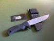 The Grip: Knife grips are a big deal to me. This is where the user interfaces with the blade. The best steel in the world is made less useful by a grip that does not work. The grip material is similar to G-10, but I do not think that is what it is. I'm not even sure if McClung will say what it is. The texture is grippy without being abrasive It completely encloses the tang of the knife and is bonded with some sort of epoxy from hell. There are plenty of stories about how durable the grips are and how well-attached they are. It ain't comin' off without a hammer and a chisel. McClung's pitch is that the handle will not soak up fluids and is unaffected by gas, DEET, or most other solvents. I'll take his word on that. I think they may even stand up to cleaning in an autoclave. The grip will also insulate the user in the event they inadvertently cut into a live wire.
