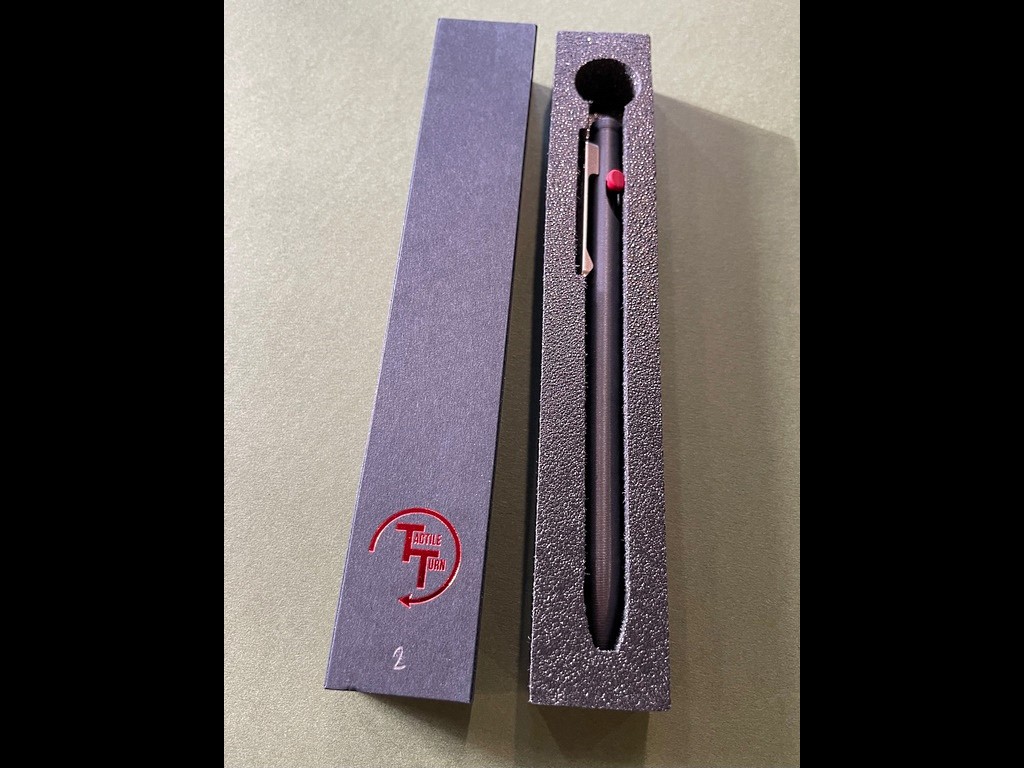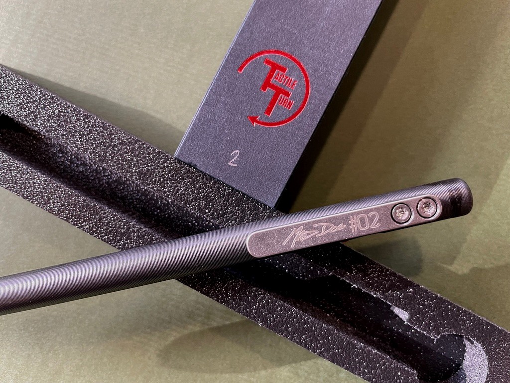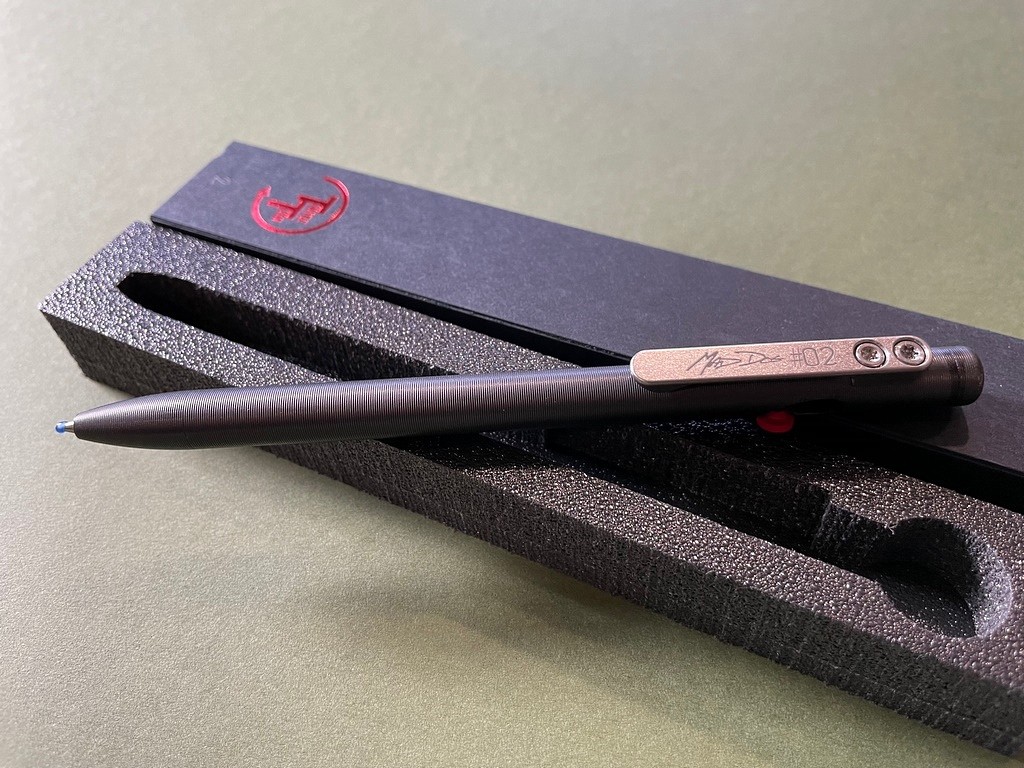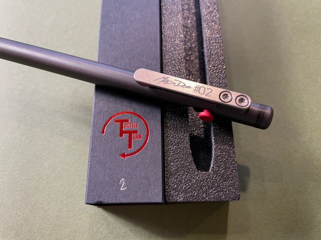 Numbered, Limited Edition Mad Dog bolt action pen made by Tactile Turn down in Texas. DLC Coated Titanium. The bolt is also titanium, cerakoted red.