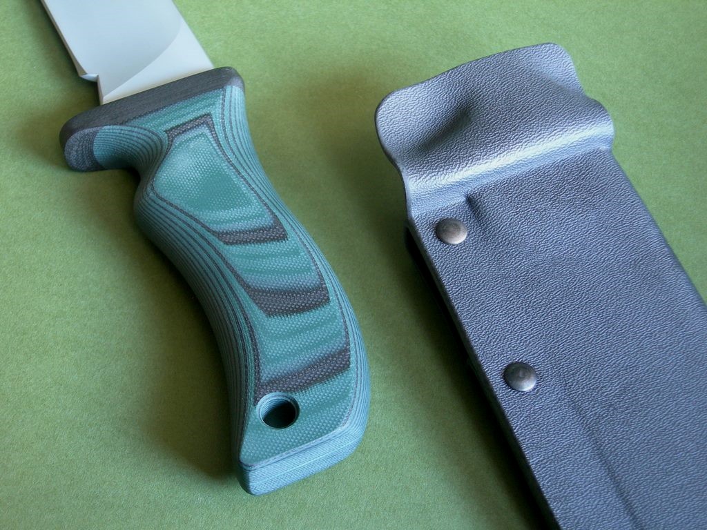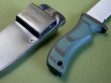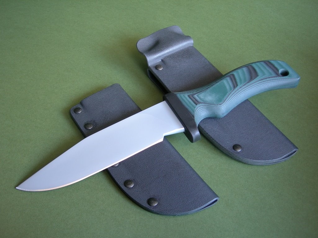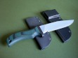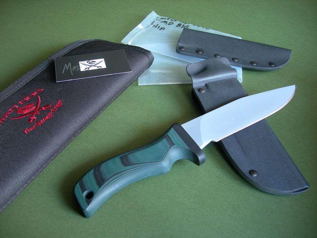 Summary: brand new Mad Dog Knives "Centurion" with two sheaths. If you’re looking for this model I’m the only guy who has them for sale. This knife has a 6" hard chromed blade and T1 choil, VVTL finish with large JMD on the blade. Mad Dog trademark on the back ricasso, made from 1/4" stock with an overall length of 11". This one was handled with the black / green material, compression bonded to the hidden tang. This knife is brand new and in mint condition.