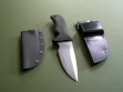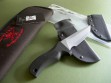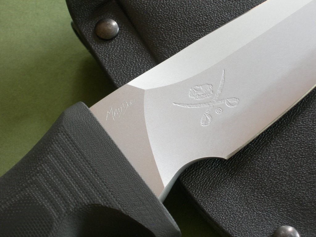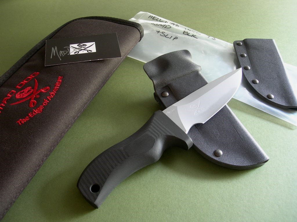Summary: this is a new Mad Dog Knives "Hell Toad", a relatively rare model not often seen for sale. This knife has a 4.5" blade with VVTL finish and custom T3 choil, Mad Dog trademark on the back ricasso with small JMD on the blade. Upper clip is sharp, overall length is 9". The black handle material is the proprietary glass / epoxy composite -- compression bonded to the hidden full tang and incredibly ergonomic. Brand new / mint condition.