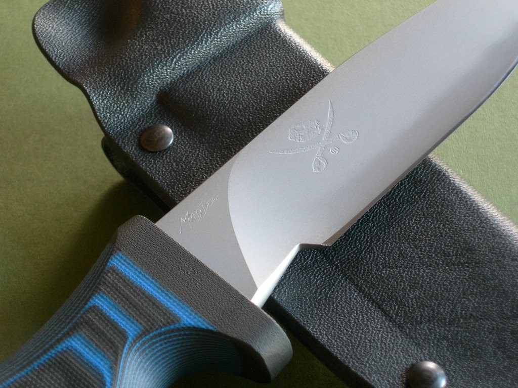 Summary: this is a brand new Mad Dog Pygmy ATAK with a 5" hard-chromed blade, small JMD and VVTL finish. The handle material is the proprietary glass / epoxy composite -- compression bonded to the hidden full tang and incredibly ergonomic. This one has the black & blue handle material, looks fantastic. This is a very stout knife made from 1/4" blade stock – overall length is 9-1/2". Mint condition.