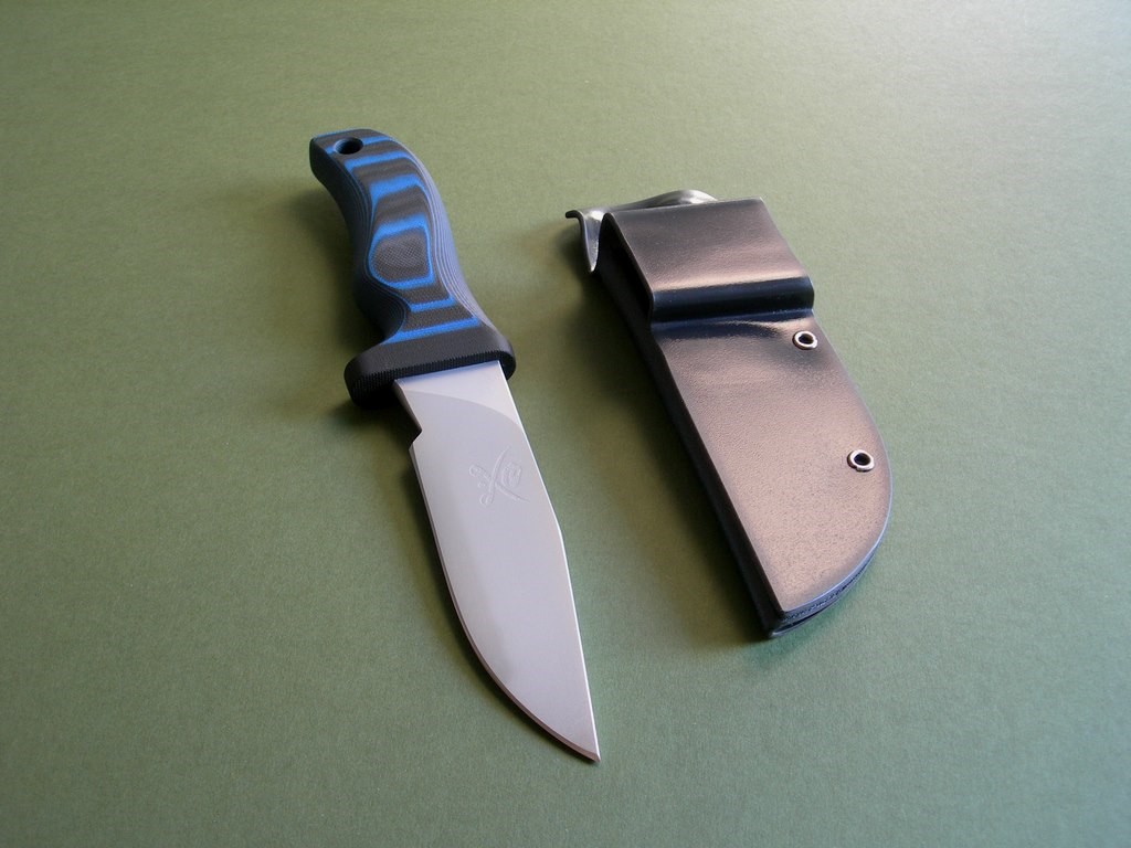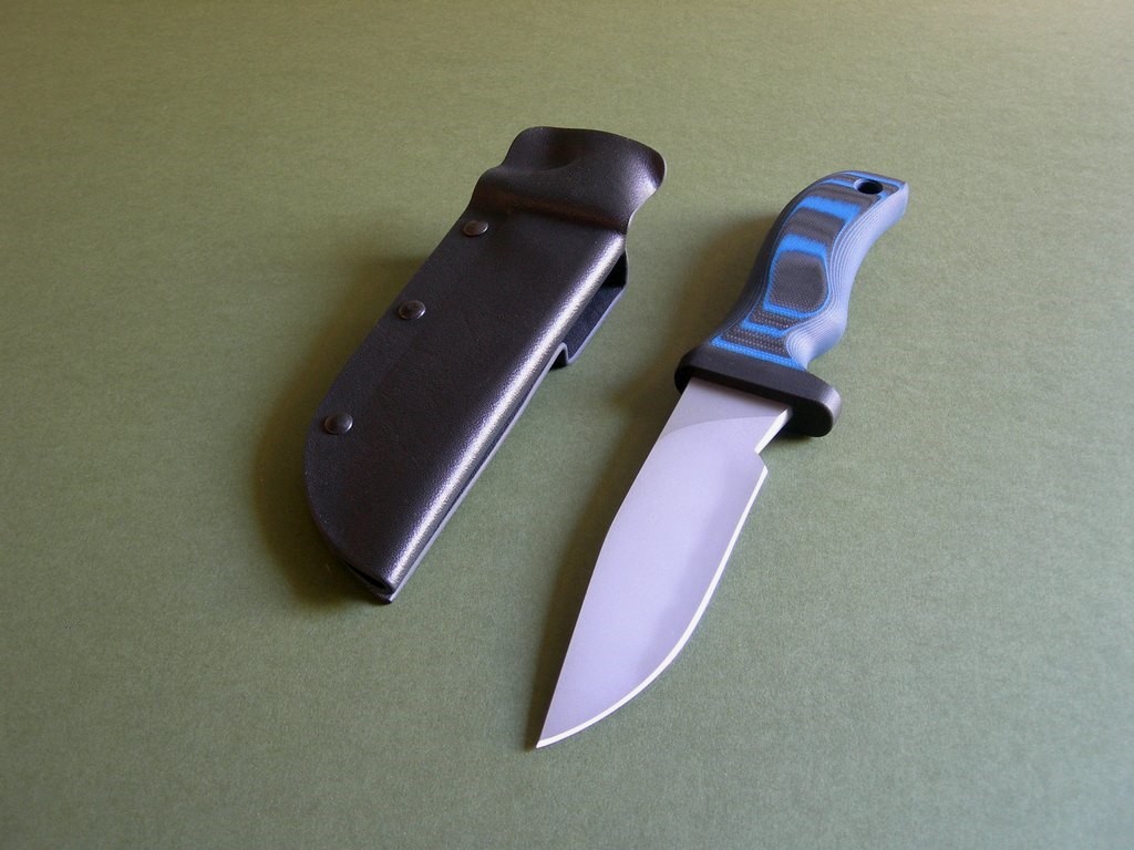 Summary: this is a brand new Mad Dog Pygmy ATAK with a 5" hard-chromed blade, small JMD and VVTL finish. The handle material is the proprietary glass / epoxy composite -- compression bonded to the hidden full tang and incredibly ergonomic. This one’s the black & blue handle material, looks great. This is a very stout knife made from 1/4" blade stock – overall length is 9-1/2". Just in with a handful of others on consignment… mint condition.