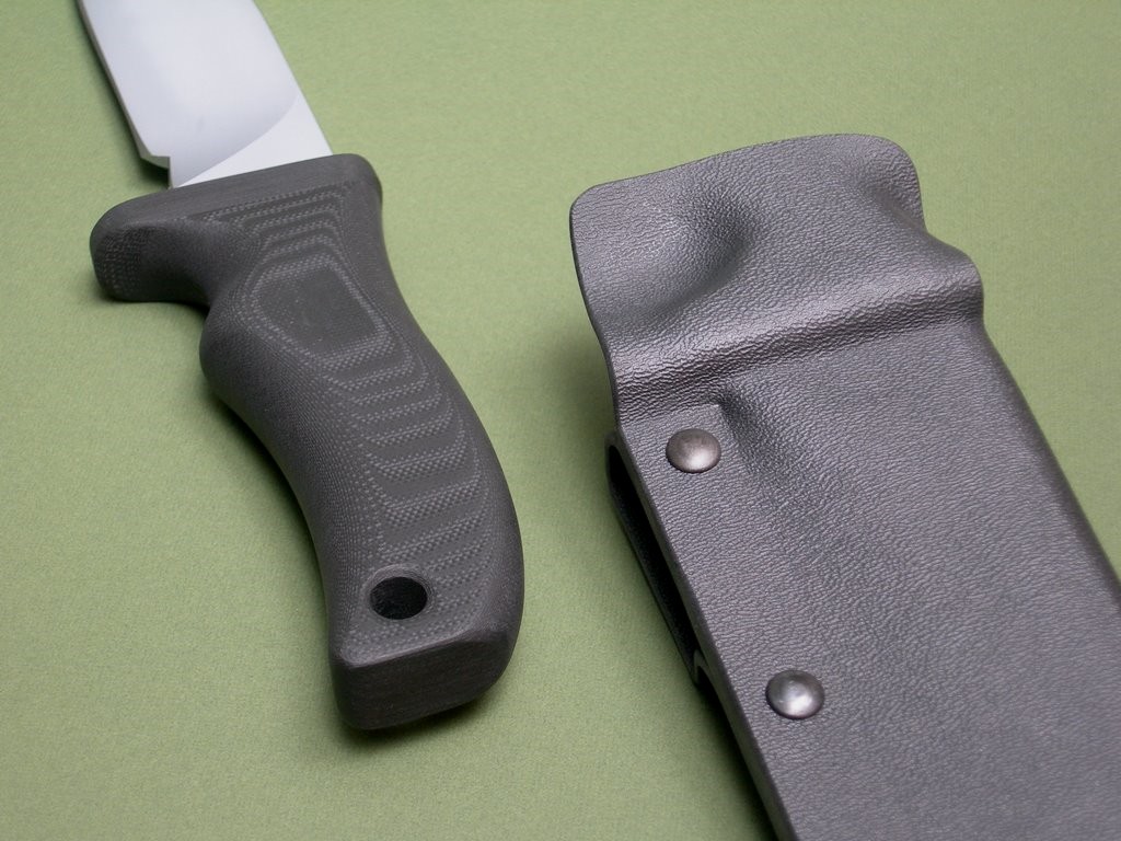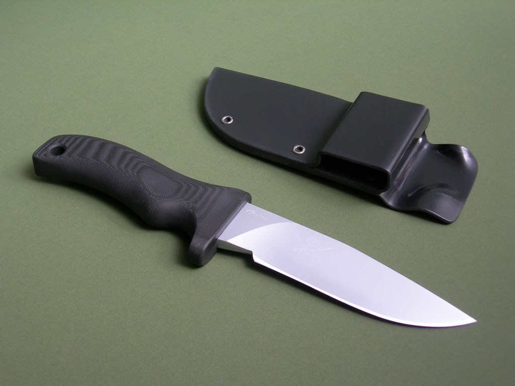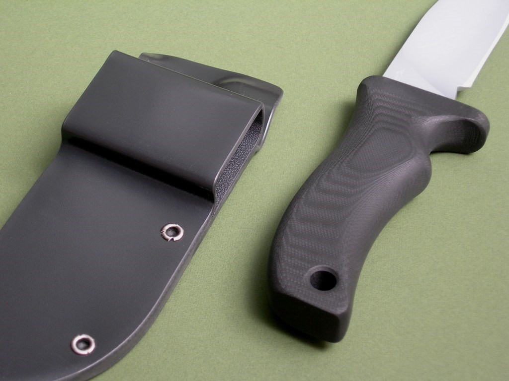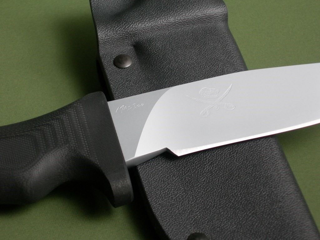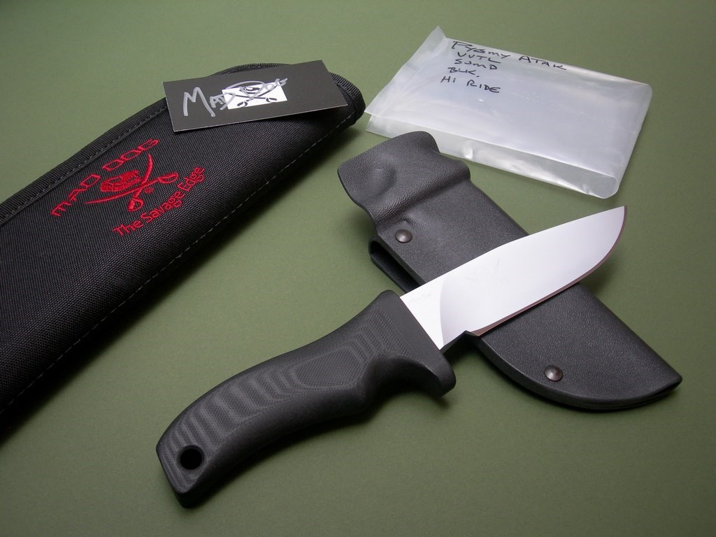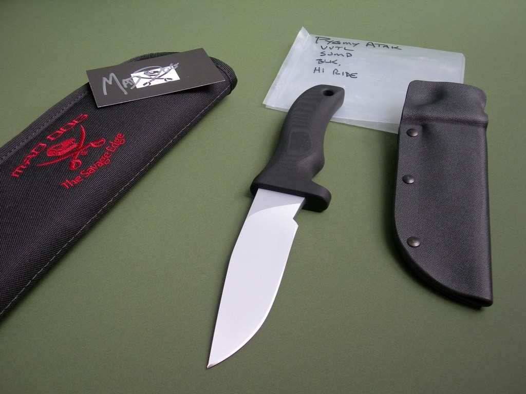 Summary: this is a brand new Mad Dog Pygmy ATAK with a 4.9" blade with VVTL finish and small JMD. The black handle material is the proprietary glass / epoxy composite -- compression bonded to the hidden full tang and incredibly ergonomic. This is a very stout knife made from 1/4" blade stock – overall length is 9-1/2". Mint condition.