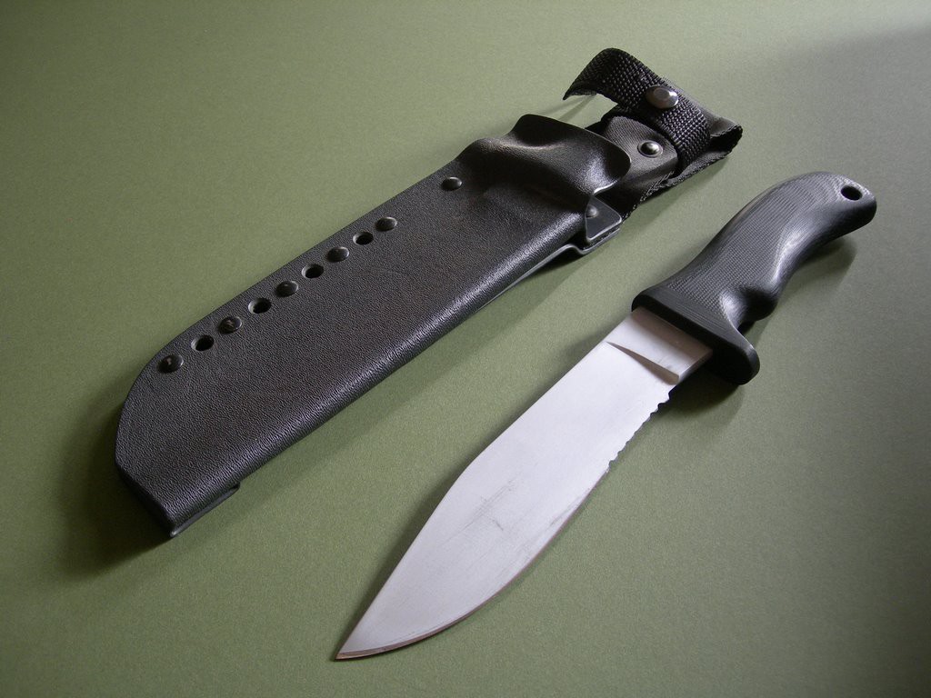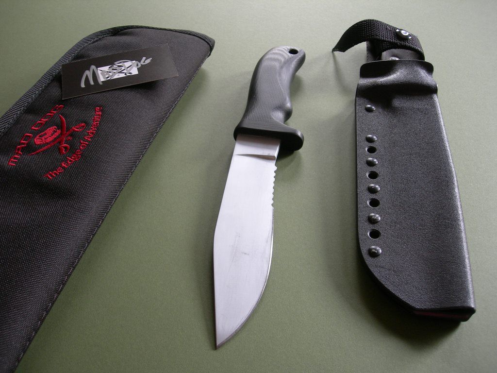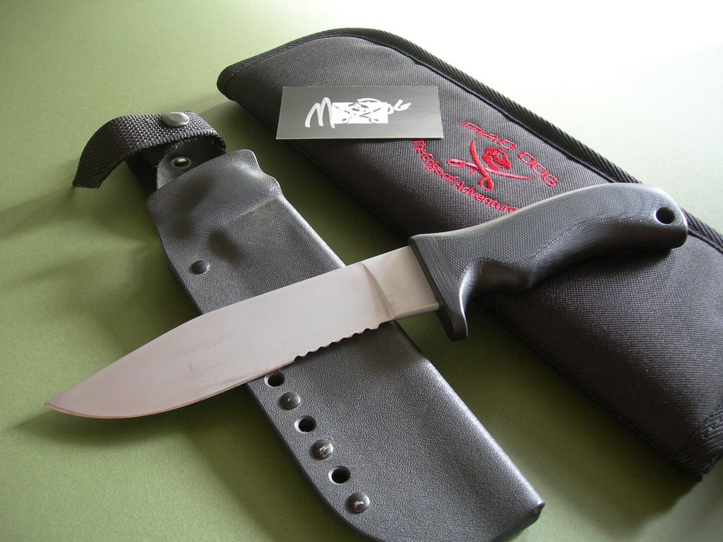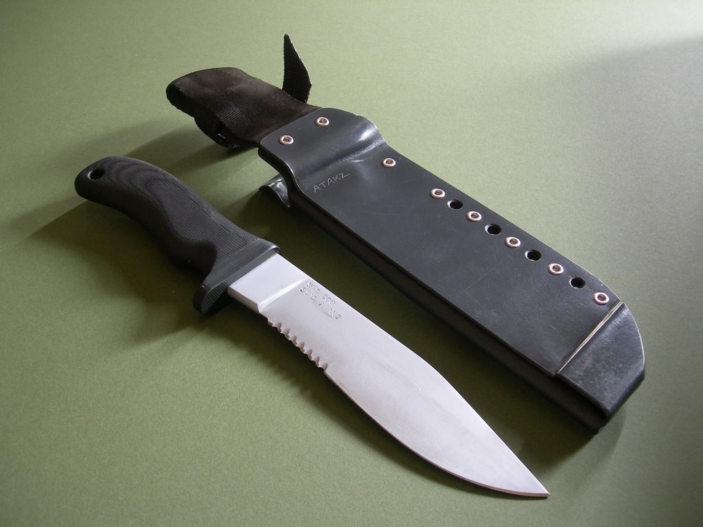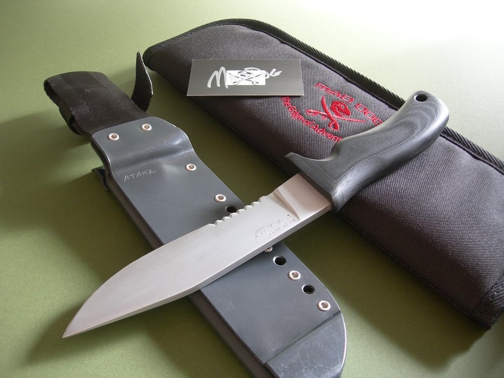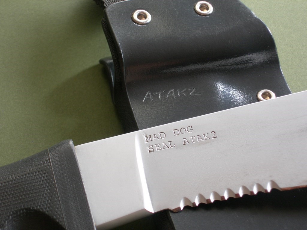 Summary: this is an older mid-1990's Mad Dog Knives ATAK 2 with 6-3/4" hard chromed Starrett 496-01 blade. 1/4" blade stock – the handle material is the proprietary glass / epoxy composite compression bonded to the hidden full tang and incredibly ergonomic. Overall length is exactly 11-1/2". Etched "Mad Dog SEAL ATAK2" trademark on the blade – this knife has been lightly sharpened and has abrasion marks on both sides of the blade from past use / insertion.