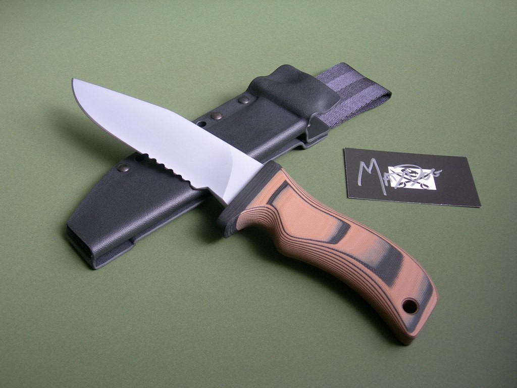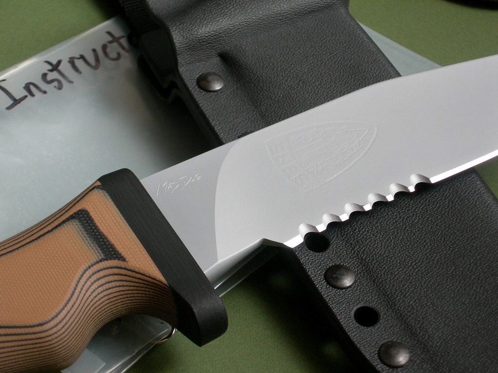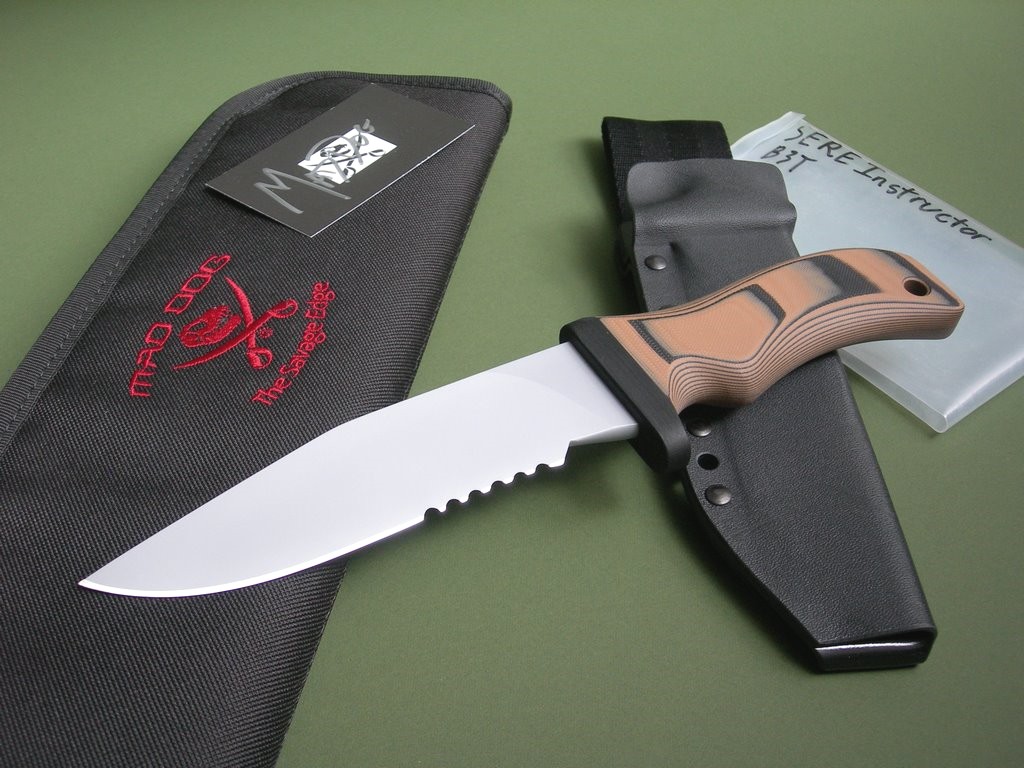 Summary: Mad Dog “SERE INSTRUCTOR” with 6” hard chromed partially serrated blade, custom etching, type 1 choil and black / tan composite handle. The overall length of the knife is 11”, mint condition. It’s a kick ass knife, perfect for EDC, survival or military use.