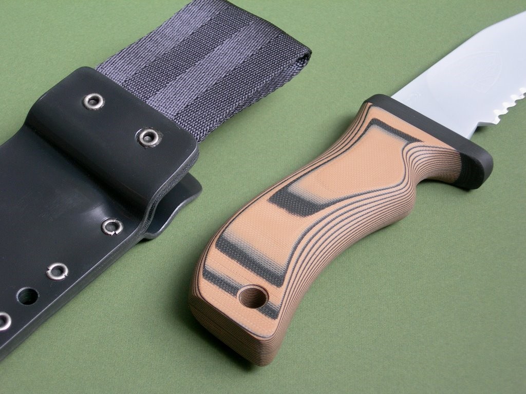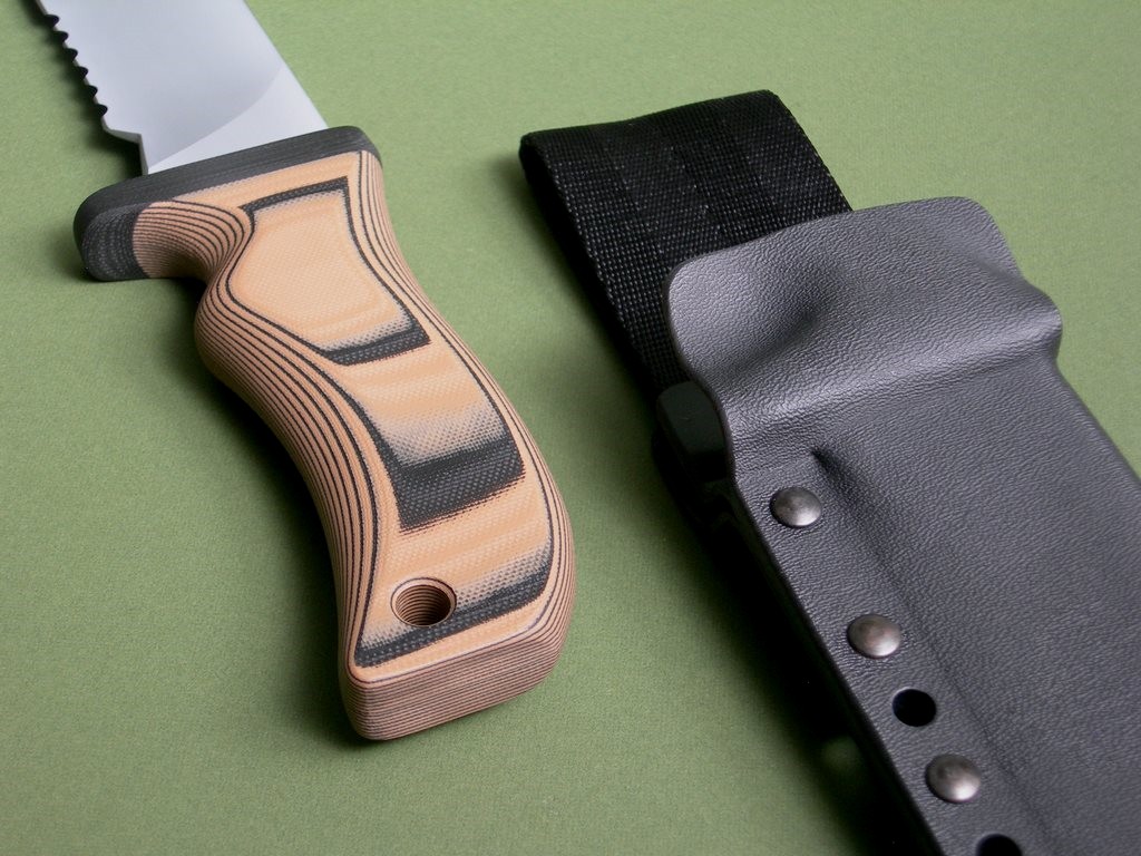 10 photos for review – as shown, a new Mad Dog Knives carry case is included. Just a handful of this SERE model have been made thus far and just this one black / tan SERE in stock right now. Additional information below... thanks and good luck.