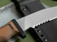 The blade features approximately half length serrations (6 cuts), tremendous strength and all of the virtues sought out by Mad Dog users for the last 30+ years. It also features the new SERE Instructor™ logo beautifully etched into the blade, as well as a new sheath design that makes it more comfortable to carry with a ruck. The new SERE Instructor™ sheath design is a modification to the Kevin McClung designed ATAK™ style sheath, and although not a Jump Sheath, it is very secure and allows speedier deployment of the knife. All handmade in America, by Americans, all American Materials. MAD DOG KNIVES. Fuck Yeah.”