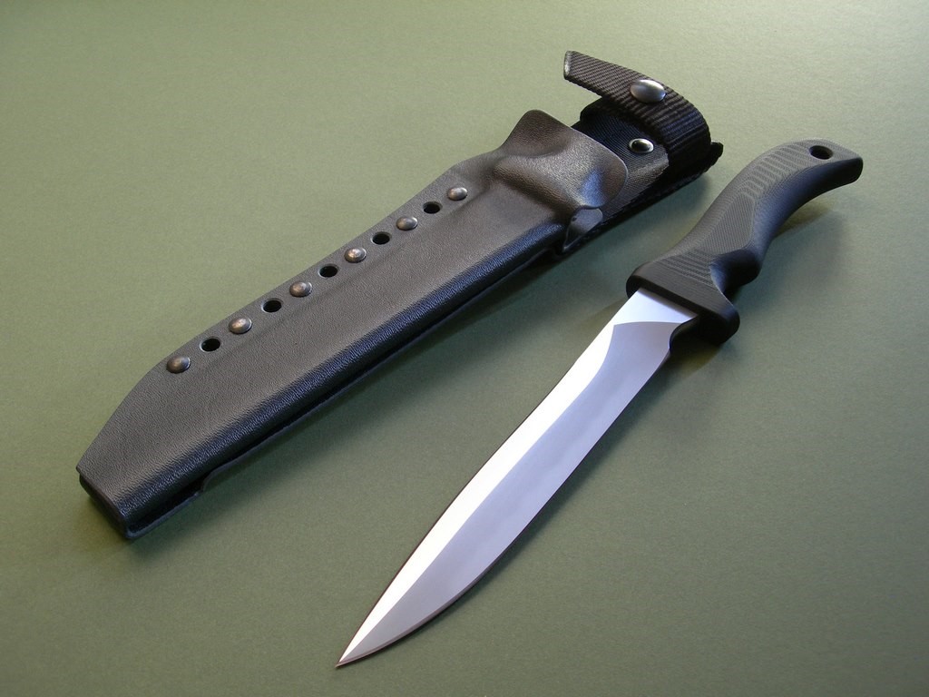 Summary: a Mad Dog Knives “Shrike” with a double-edged 7" blade, VVTL finish and super small JMD blade etching. Upper edge fully sharpened – it's very fast in hand and extremely versatile. The black handle material is the proprietary glass / epoxy composite -- compression bonded to the hidden full tang and incredibly ergonomic. 1/4" blade stock with the optional type 3 choil – overall length is 12". Mad Dog trademark on the blade, this knife is brand new and in mint condition.