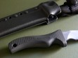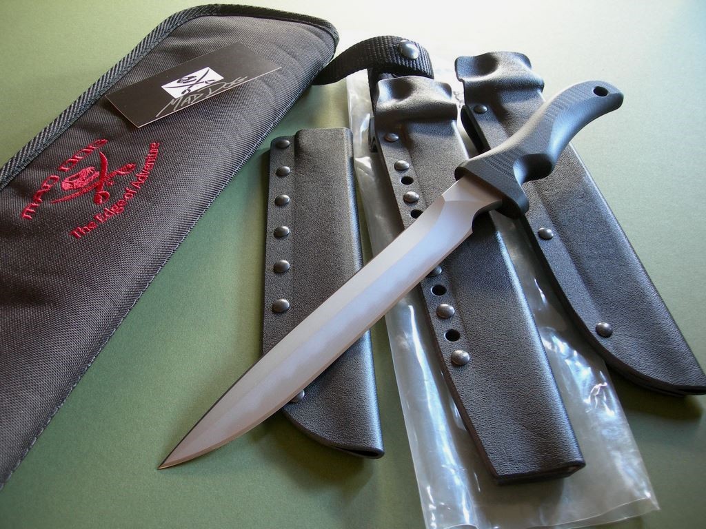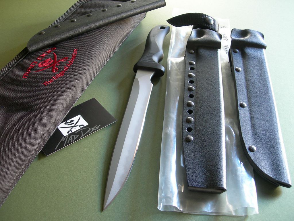 Summary: double-edged Mad Dog Knives Shrike with an 8" blade and VVTL finish. Upper edge fully sharpened – it's very fast in hand and extremely versatile. The black handle material is the proprietary glass / epoxy composite -- compression bonded to the hidden full tang and incredibly ergonomic. 1/4" blade stock with the optional type 3 choil – overall length is 12-1/2". Mad Dog trademark on the blade, this knife has never been used and is in mint condition.