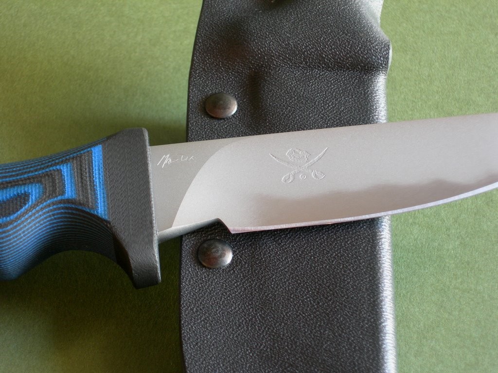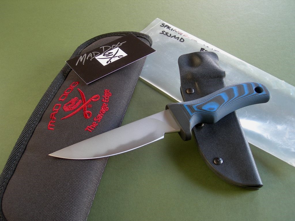 Summary: this is a Mad Dog Knives Springbok with 4-1/2" hard chromed blade with VVTL finish. Blade is perfect -- razor sharp with a type 1 choil and small JMD. The black & blue handle composite handle -- compression bonded to the hidden full tang and incredibly ergonomic. 3/16" blade stock – overall length is right at 9". This knife is in mint condition.