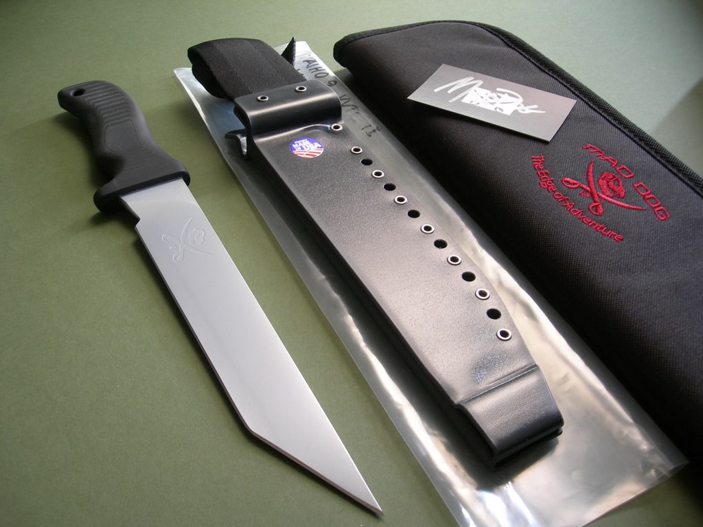 8 photos for review β as shown, a new embroidered Mad Dog carry case is included. This model is outrageously nice with the tanto blade, VVTL finish and custom etch, it's a very rare model and you could wait a long, long time to find another like it. It looks wickedly nice and feels even better in hand, a perfect Mad Dog knife for collection / investment purposes. Great price... the first to buy gets his or her choice of custom etch. Thanks and good luck.