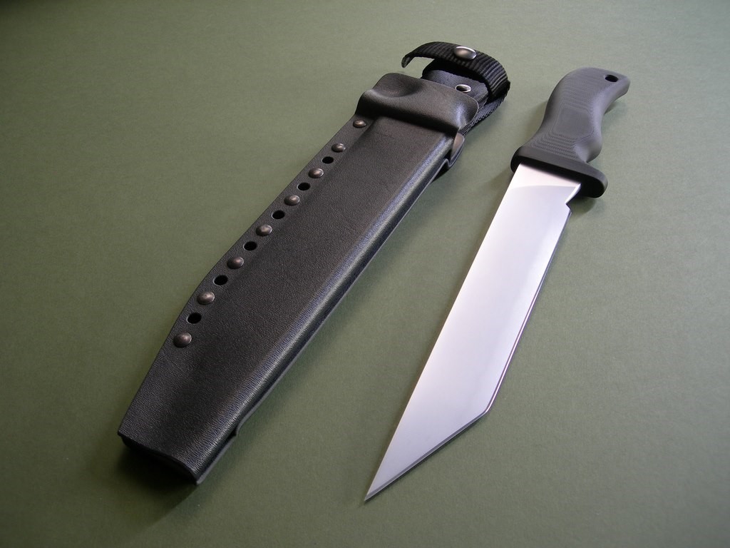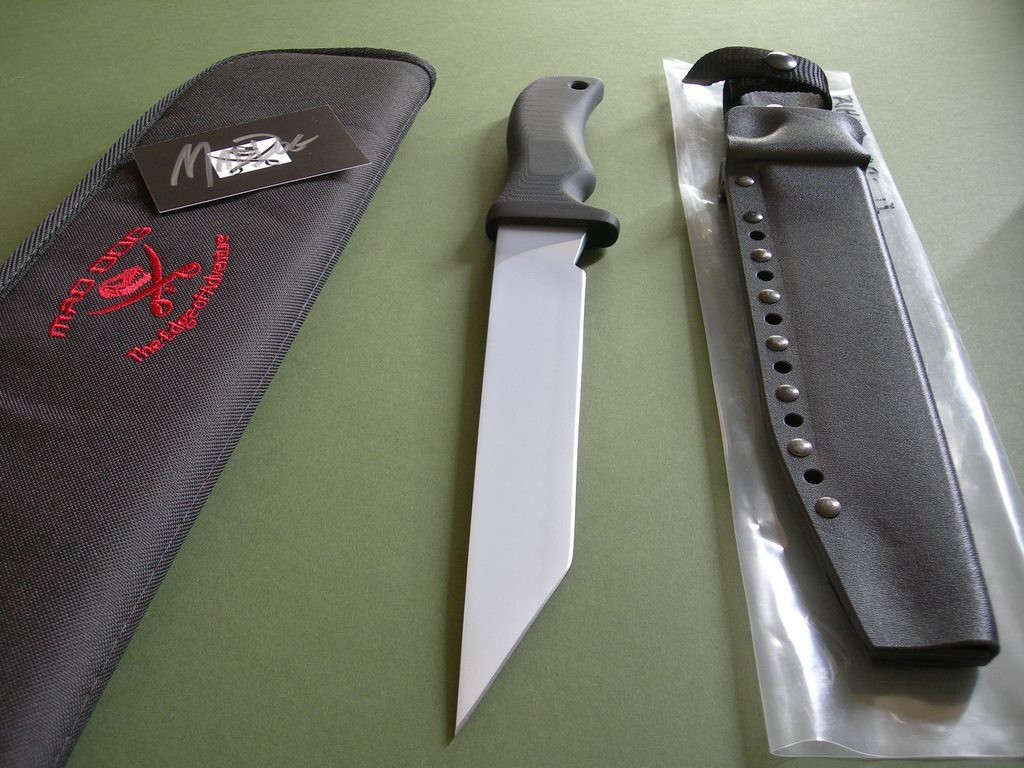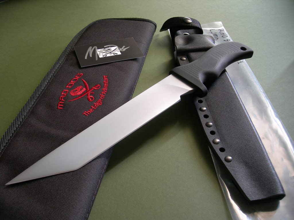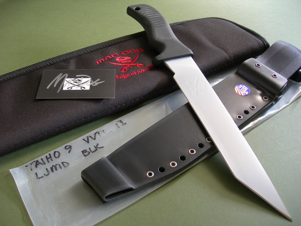 Mad Dog "Taiho 9" with a 9" hard chromed tanto blade and upgraded VVTL finish. Large JMD etching, type 1 choil. This is a heavy hitting tactical fighter, 1/4" blade stock with an overall length of 14-1/8". I haven't seen another Taiho 9 for sale other than my website, this knife is unused and in brand new / mint condition.