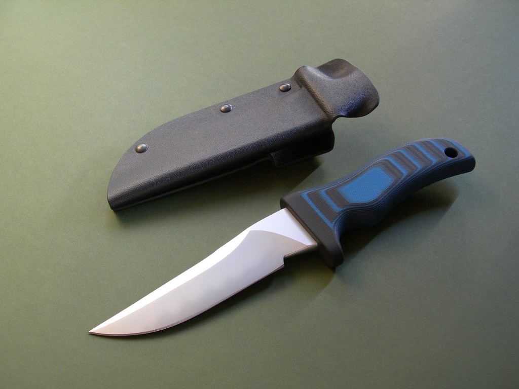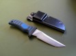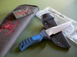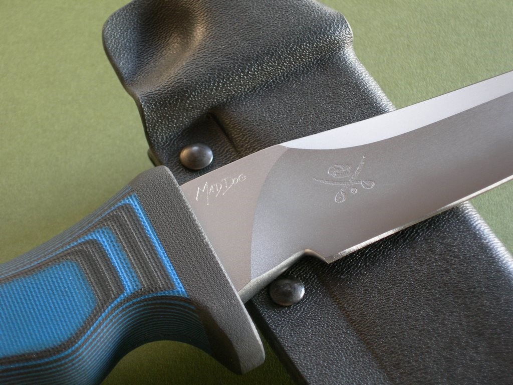 Summary: Mad Dog War Pyg. This new Mad Dog model has a 5” double-edged blade with VVTL finish and super small JMD, type 1 choil and black / blue composite handle. Double edged with the clip sharpened back about 2.75", overall length is 9-1/2”. Mint condition.