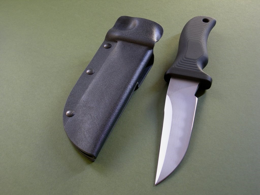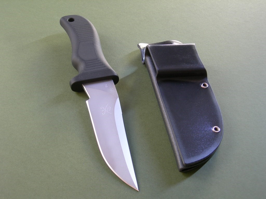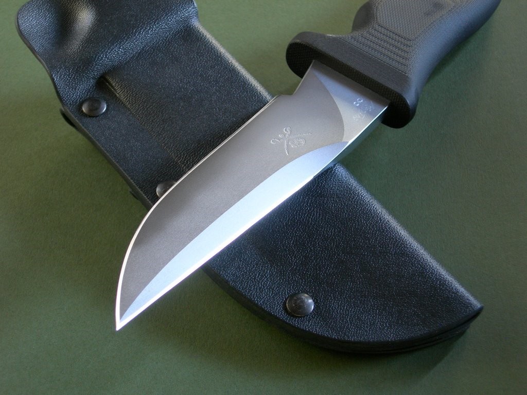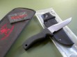 Summary: the first 10 numbered Mad Dog War Pyg’s are finally in! This new Mad Dog model has a 5” double-edged blade with VVTL finish and super small JMD, type 1 choil and black composite handle. Double edged with the clip sharpened back about 2.75". Ground from 1/4” blade stock, overall length is 9-1/2”. Mint condition, wickedly nice.