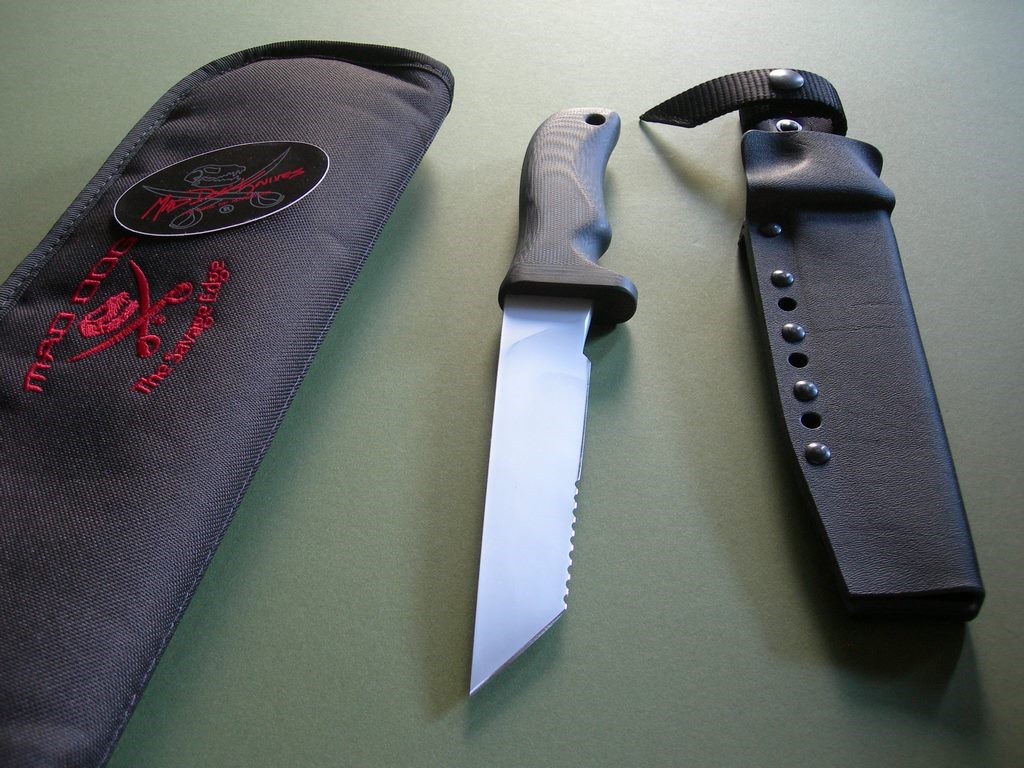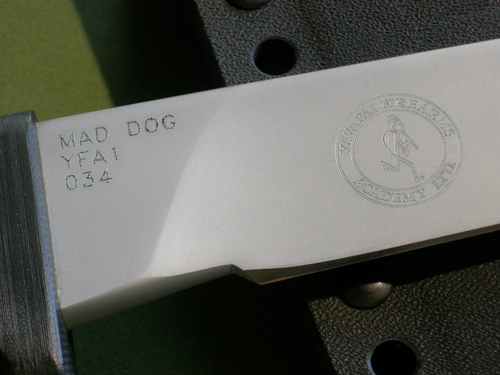 Unused, the blade is pretty much perfect. The back side blade with the YFA emblem, also shop etched "MAD DOG YFA1 034" on the ricasso. Handle looks new, gorgeous condition.