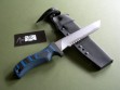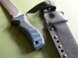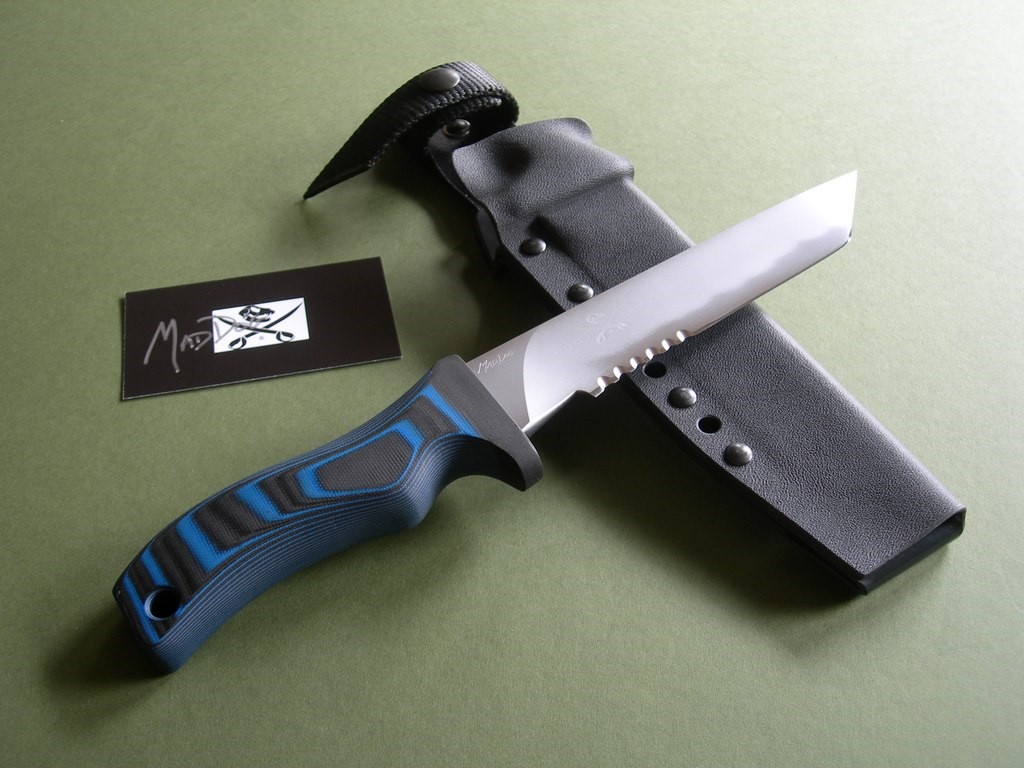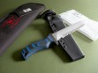 This knife has a 6” hard chromed, partially serrated tanto blade with small JMD logo. Type 1 choil, the above mentioned new blue / black composite handle. O.A.L. on these are 10-1/2”. These knives come with the upgraded ATAK sheath, all knives and sheaths in mint condition.