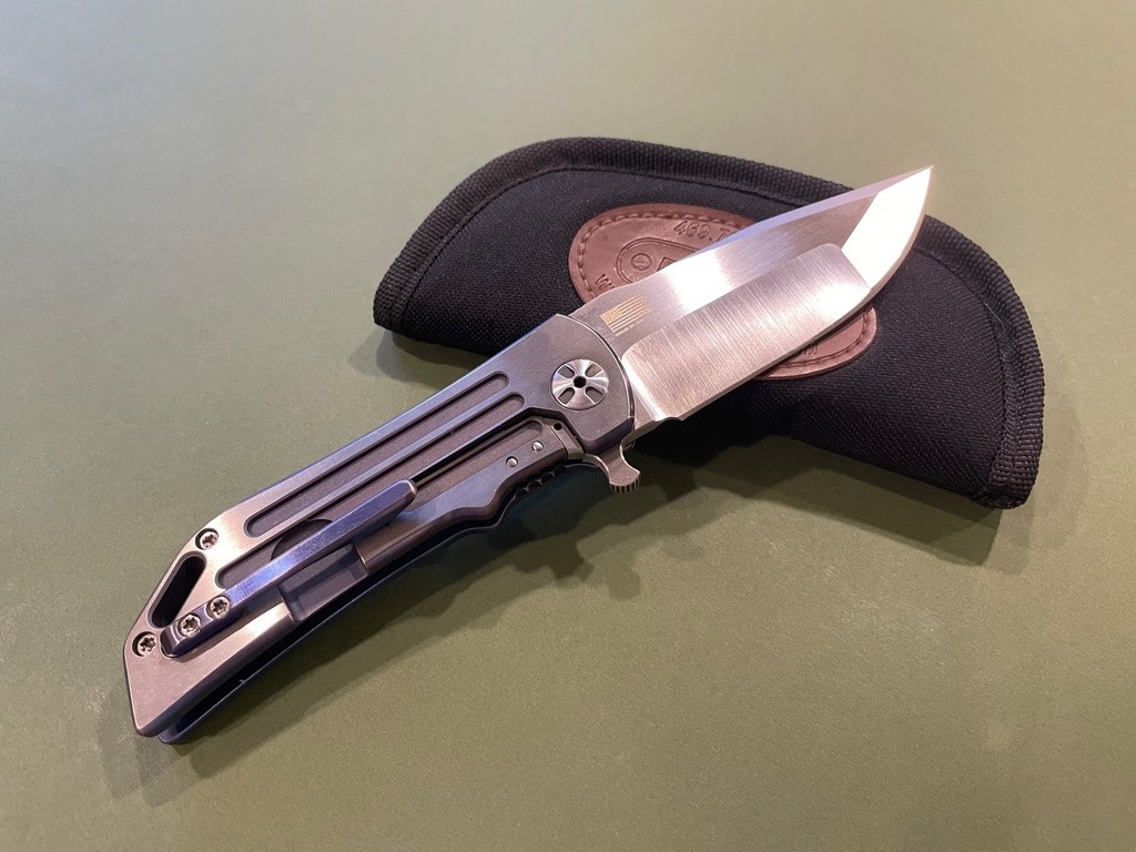 This level 2 model has a compound ground CPM-S35VN blade with a brushed satin flats. It measures 0.179" thick but is thin enough at the edge that we know this knife will be an excellent slicer. The handle is made from 6AL4V aircraft grade titanium with polished satin flats. The backspacer is milled titanium and the pocketclip is made from mokuti, giving this knife a little bit of flair and personality. With input from Jim Skelton, Darrel lightened up the lockbar tension to make unlocking the knife easier without affecting the lockup. It is solid and locks up like a bank vault. It's the safe queen piece you will want to carry again and again.