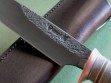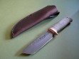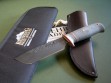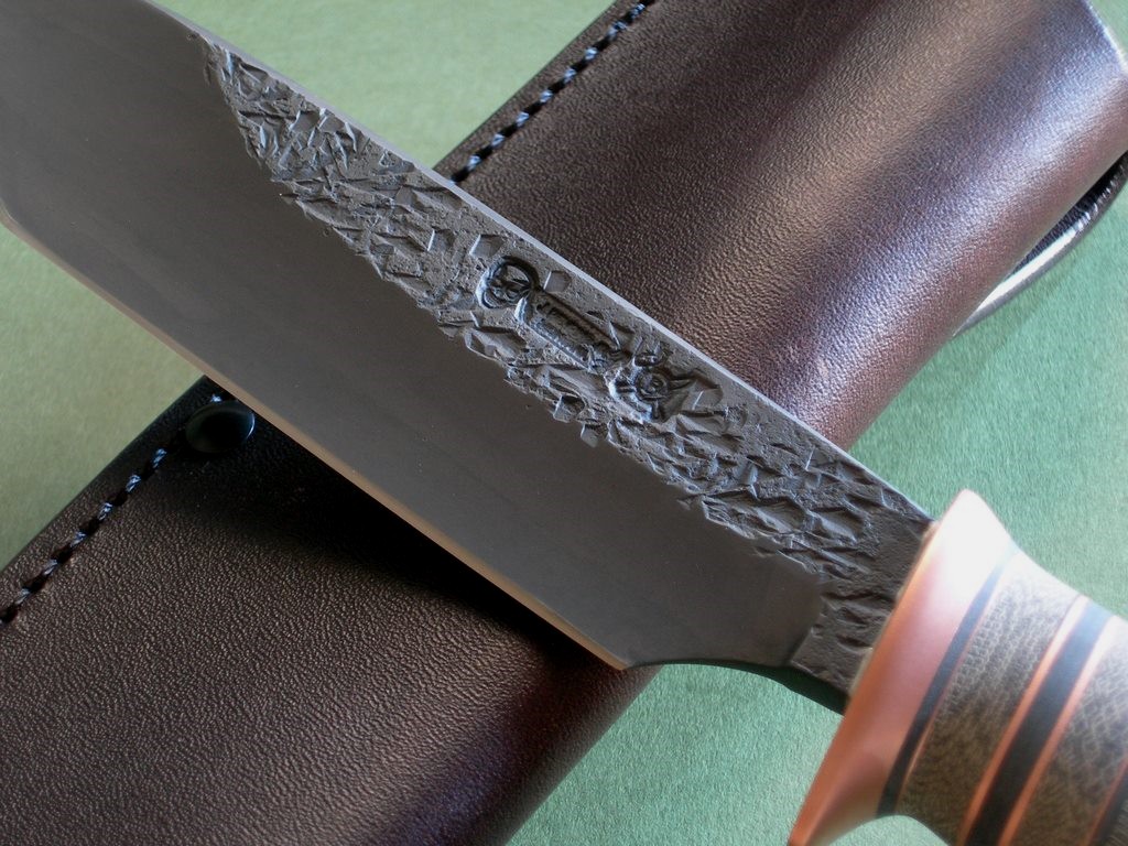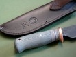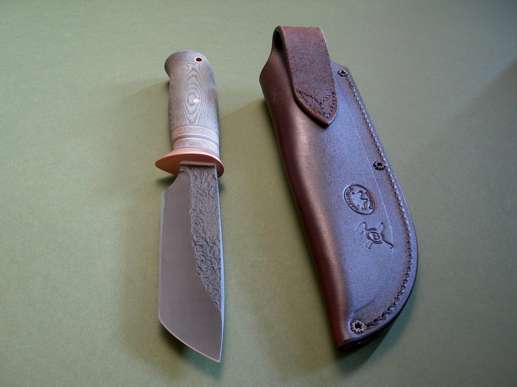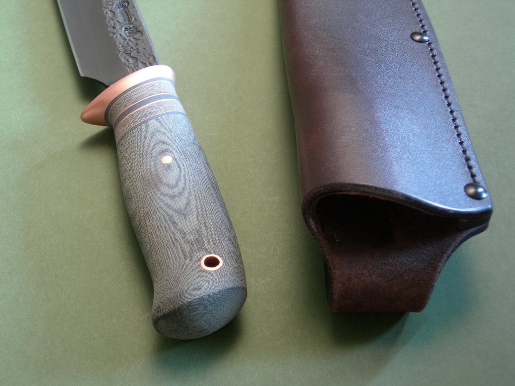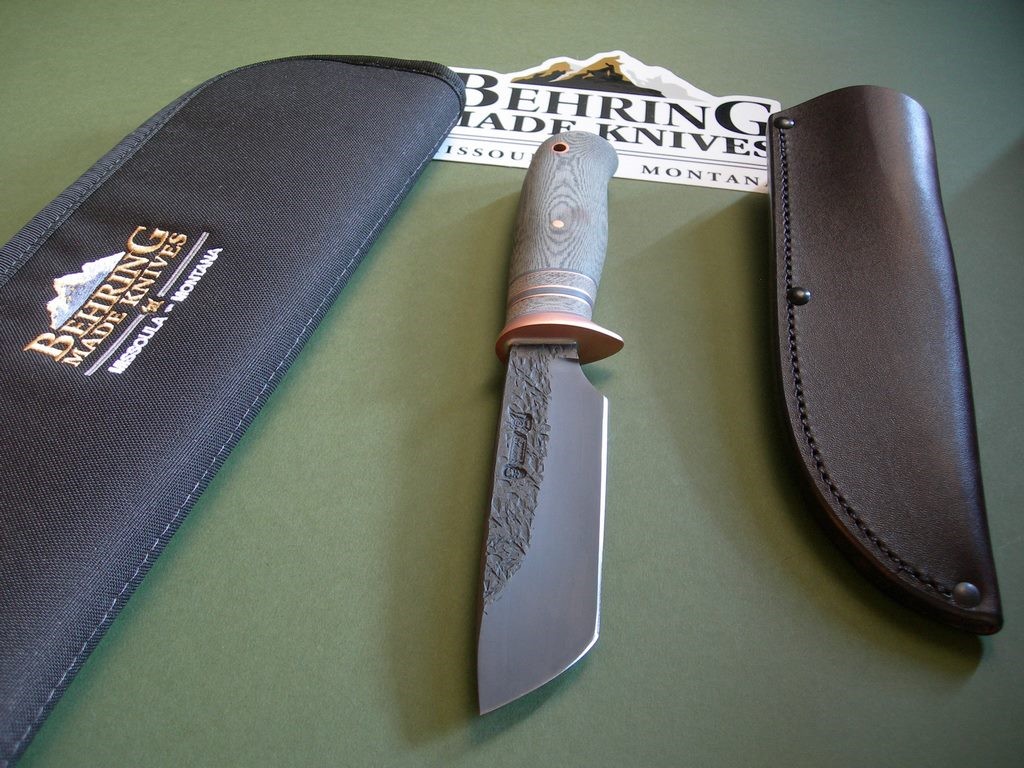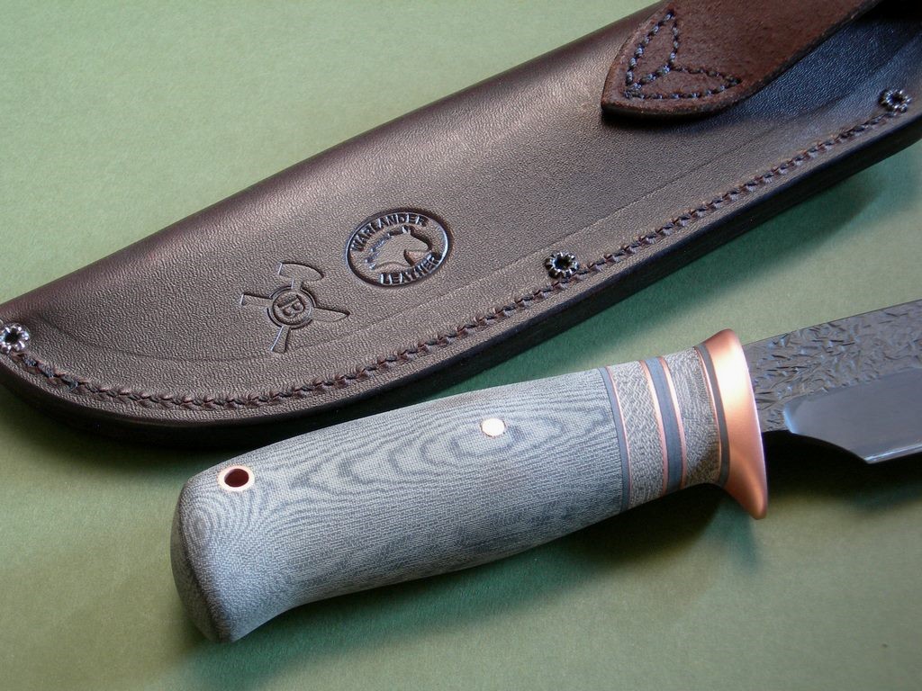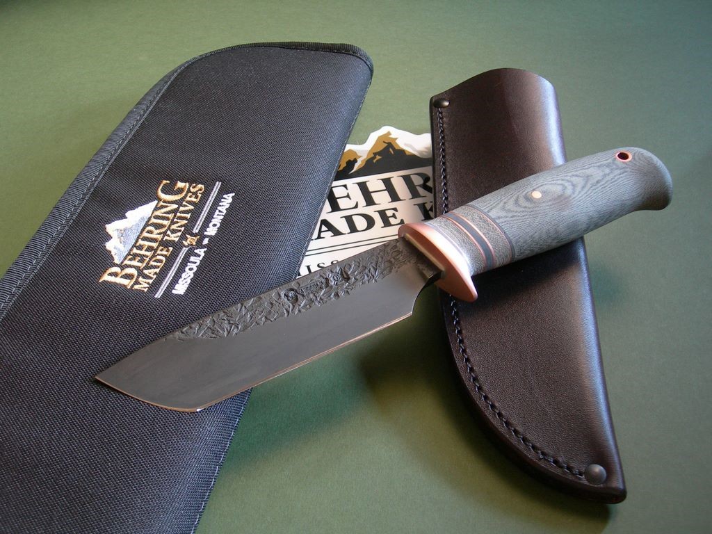 Summary: this Behring Made Valkyrie has a 5.25” hammer marked blued blade, silver soldered sand blasted copper guard, black / micarta / copper spacers with a solid OD green canvas micarta grip with a crows beak butt. ¼” stock, overall length is just a hair over 10”. Comes in a custom leather pouch sheath made by Warlander. Awesome rig, both the knife and sheath are in unused / mint condition.
