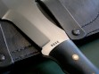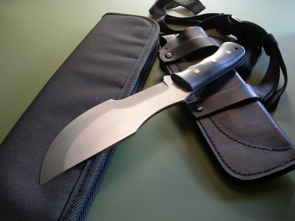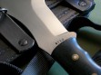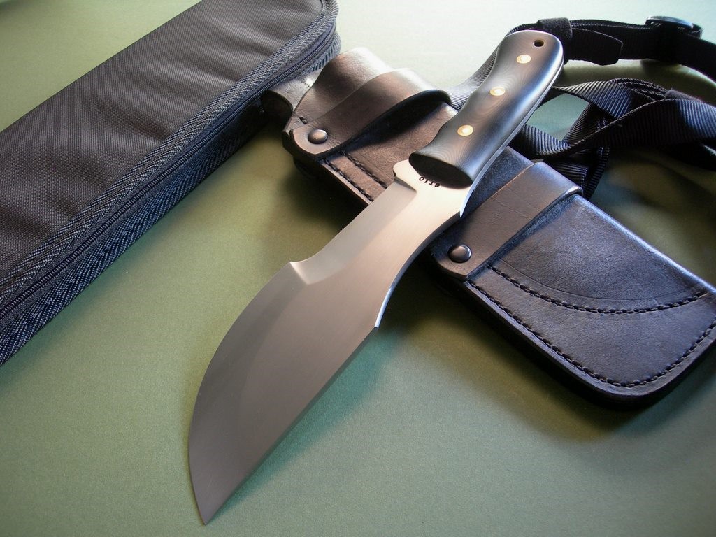 This knife has a tapering tang, black linen micarta grips secured with 2-piece Loveless bolts, and brass lined lanyard hole.