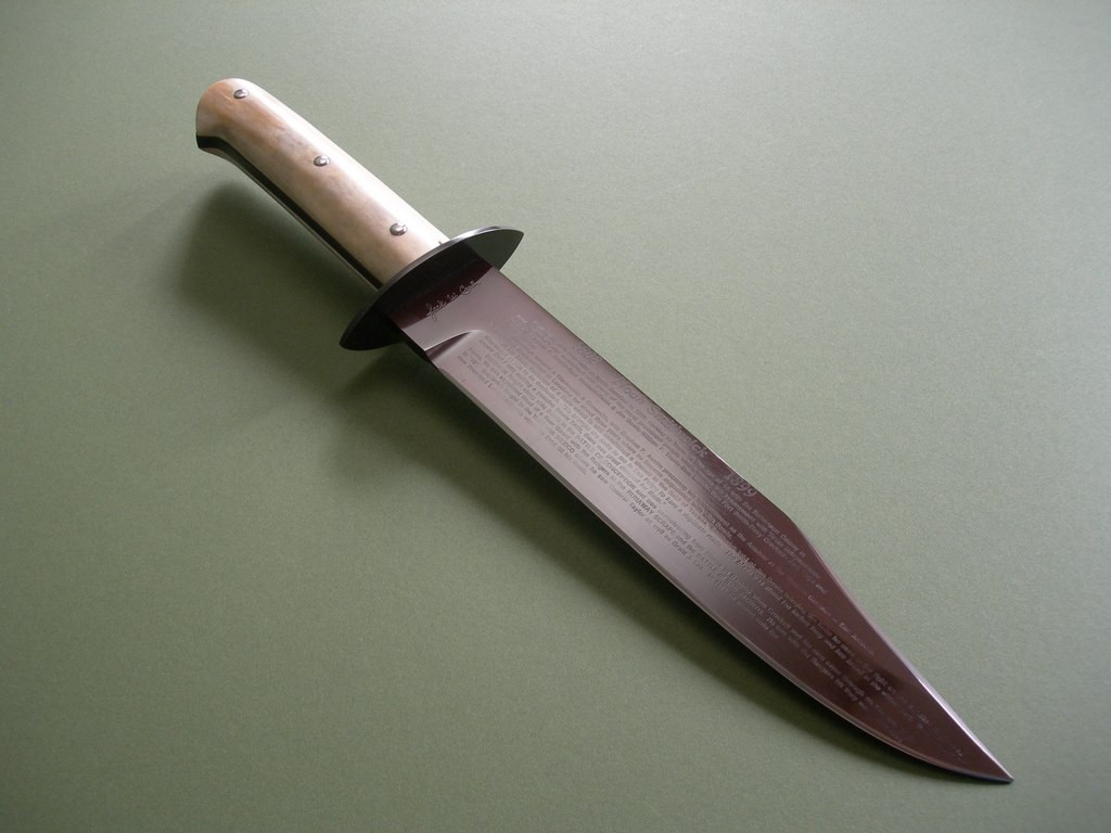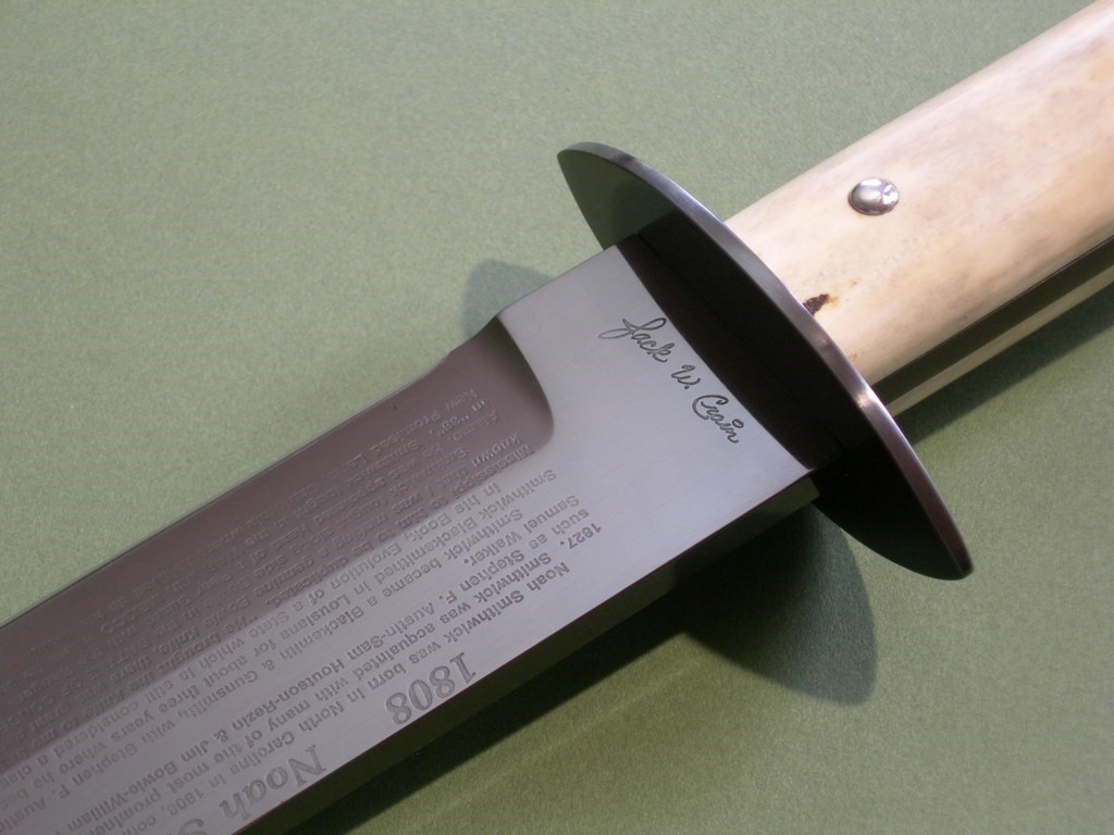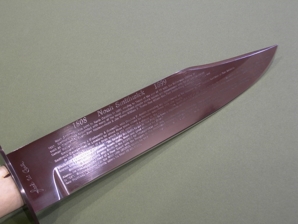 11 photos for review -- this is an incredibly rare Bowie with historical information about Noah Smithwick etched on the back side of the blade. A centerpiece in most every knife collection, a must have for discerning Bowie knife collector. Thanks and good luck.