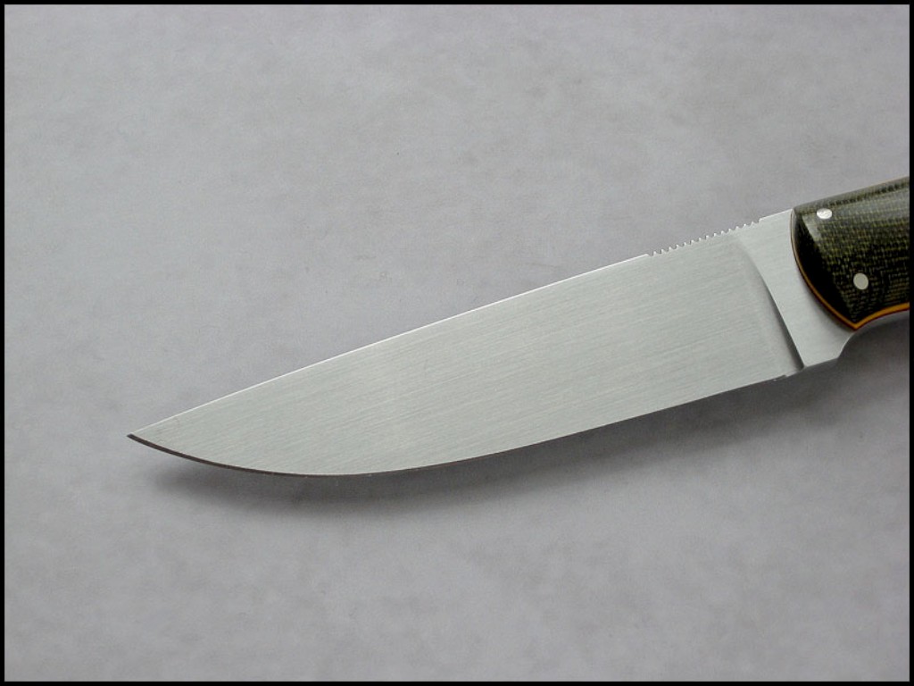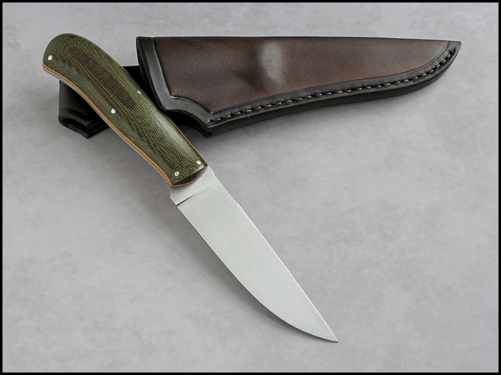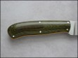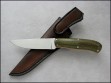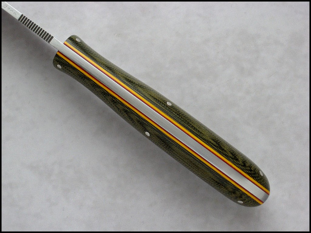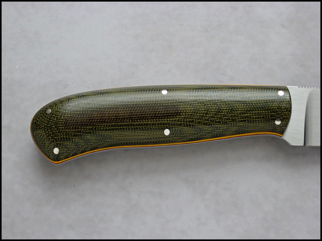 Summary: a beautiful "all purpose" knife by Poland knifemaker Marcin Bona. (Bona Knives) This knife has a 4-1/4" stainless steel blade notched for thumb placement, yellow & red fiber liners, and olive green canvas micarta handle with nickel pins. The makers mark (Bona) on the spine just ahead of the thumb jimping, Marcin marks his knives this way so as not to detract from the aesthetic beauty of the knife.