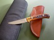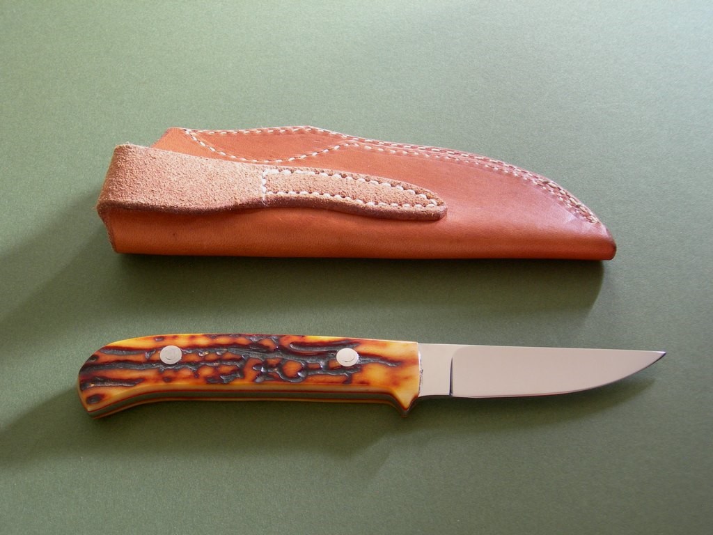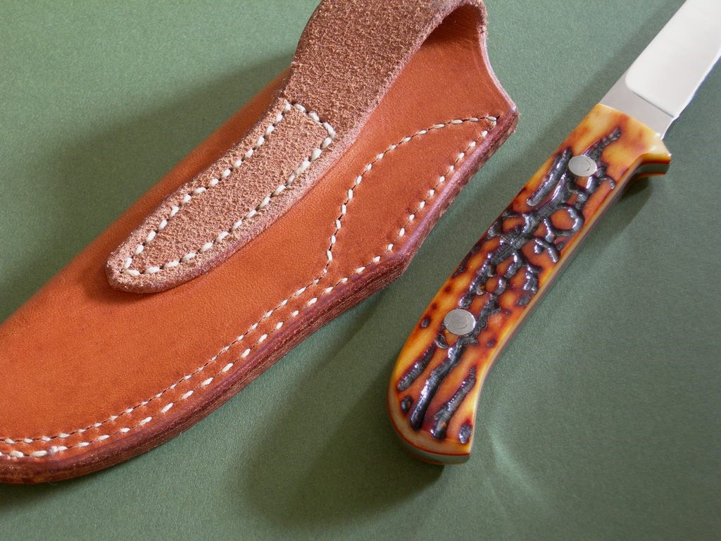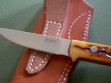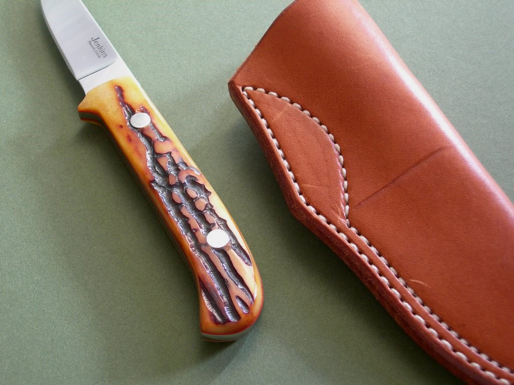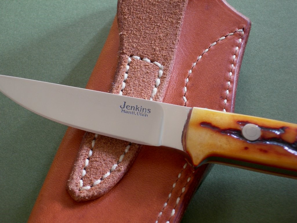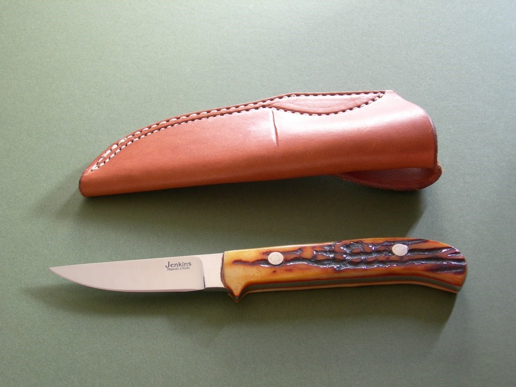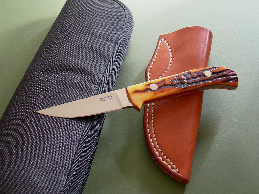 Summary: brand new / mint condition bird and trout knife made by Utah maker Mitch Jenkins. Known for his Loveless style patterns, the fit and finish is beyond compare. Fitted with beautiful stag slabs, two piece pins and red tang liner over a non-tapering tang. Overall length is 7", it's drop dead gorgeous... light enough that you can carry it daily and not even feel it on your belt.