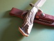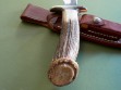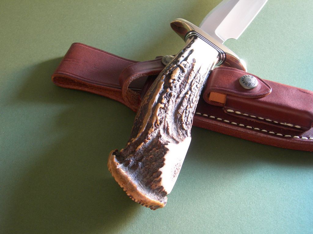 Summary: an unused Randall #3 "Hunter" with optional nickel silver double guard, custom spacers and crown stag handle. The 7" tool steel blade has it's original edge and is spotless – the knife looks new. The crown stag handle is large and really nice, looks perfect without any checks or cracks.