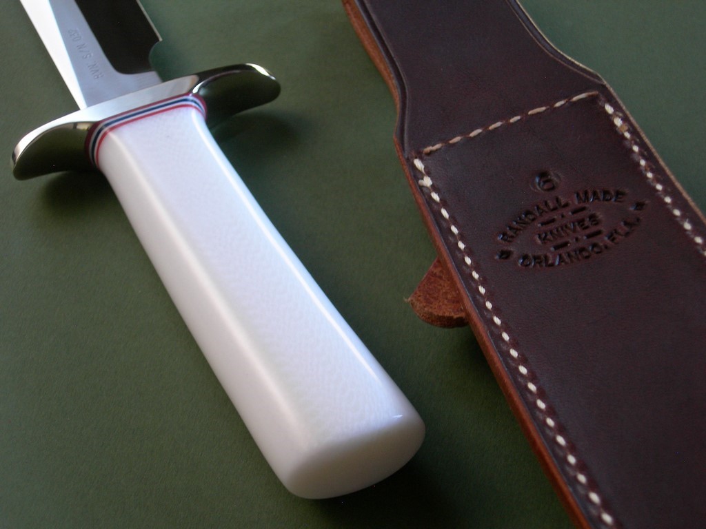Summary: this Model #5-6 by Randall Made Knives is a RKCC Club Knife marked RVN: S/N 032. (RVN stands for Republic of VietNam) It features a 6” satin finished stainless steel blade with false top edge, 1/4" blade stock and hidden tang construction. Fitted with a nickel silver double guard, red/white/blue spacers and an ivorite linen micarta handle. Comes with a brown leather sheath, original butcher paper and RMK care / instruction sheet. New from maker.