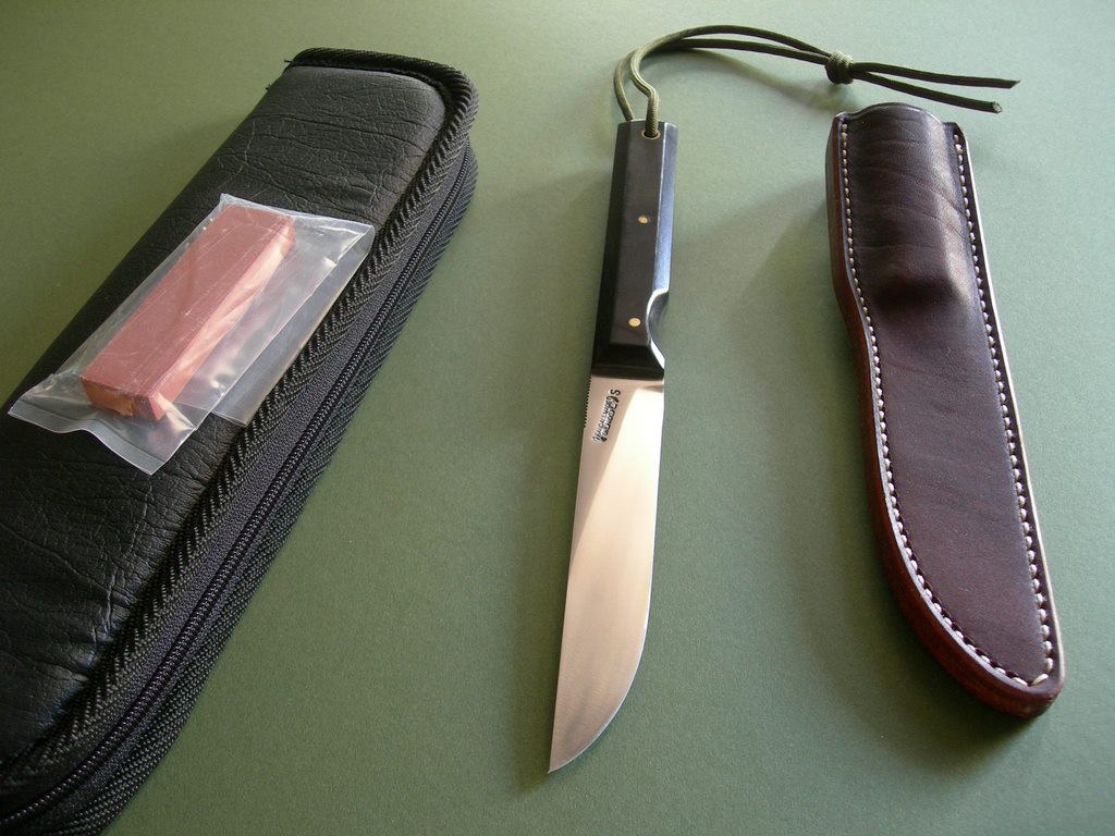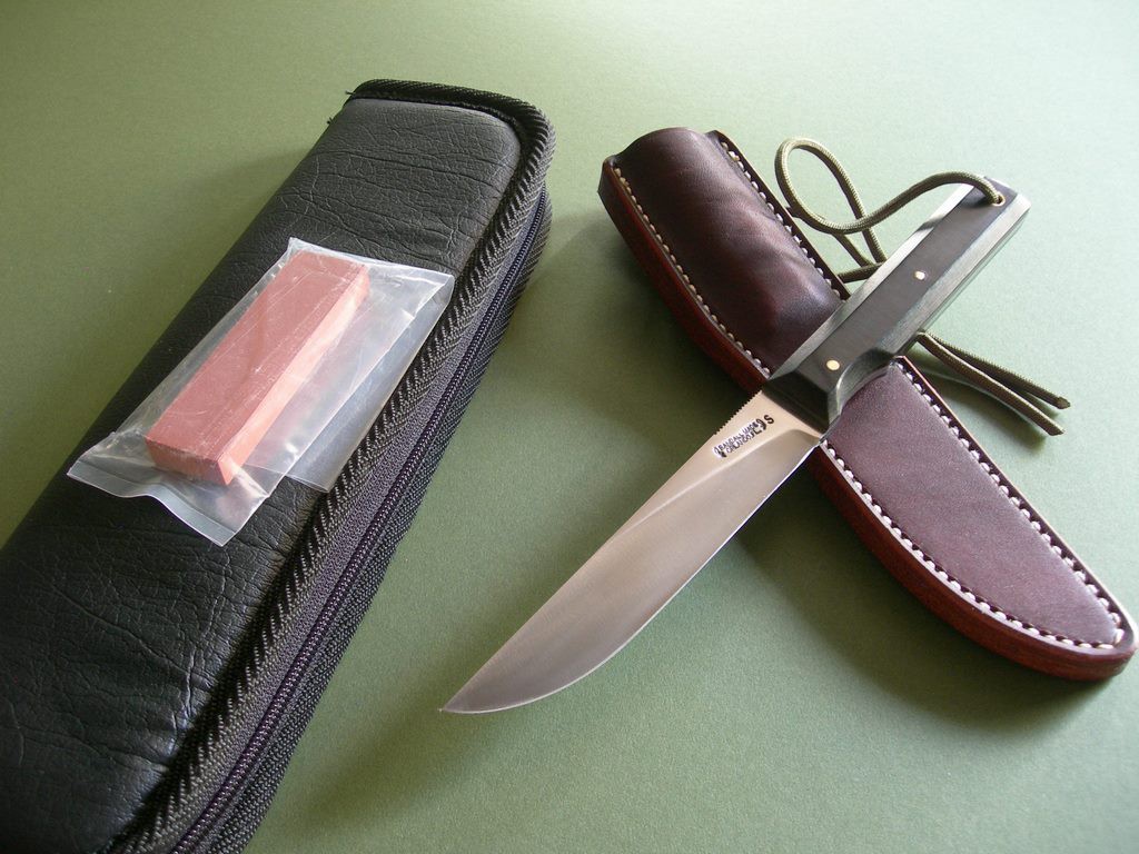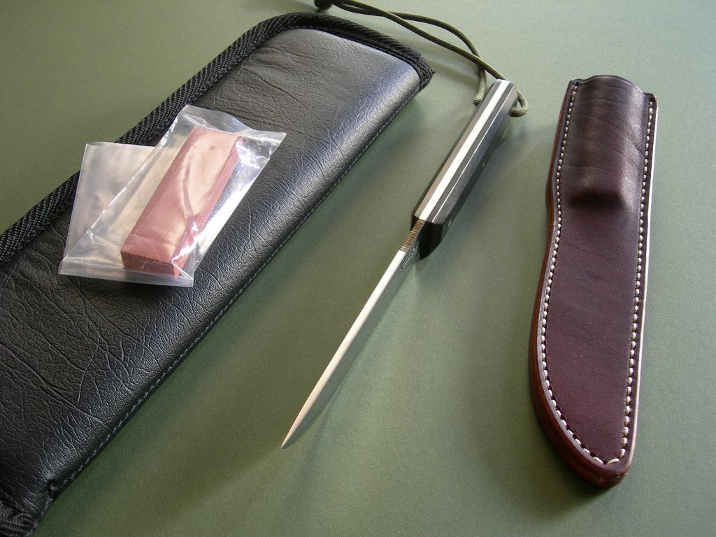 6 photos for review -- as shown, the original salmon stone and unmarked carry case both included. These model 10's are great for everyday use -- you'll be hard pressed to find a better blade for any / all of your boating / fishing needs. Thanks and good luck.