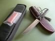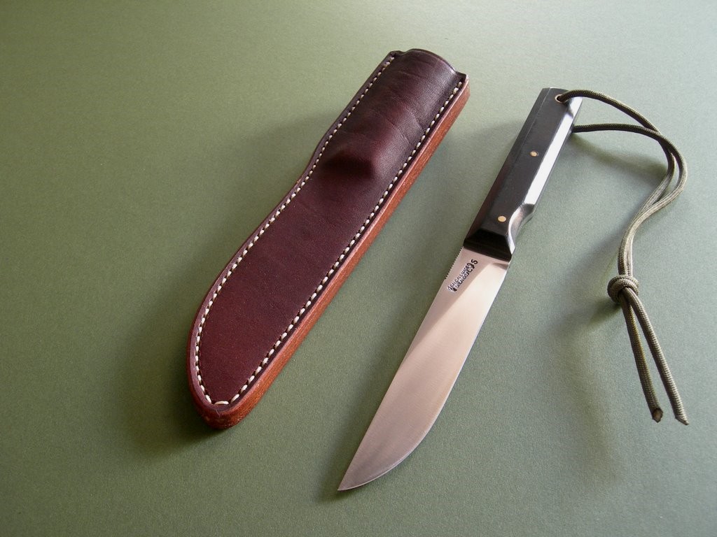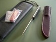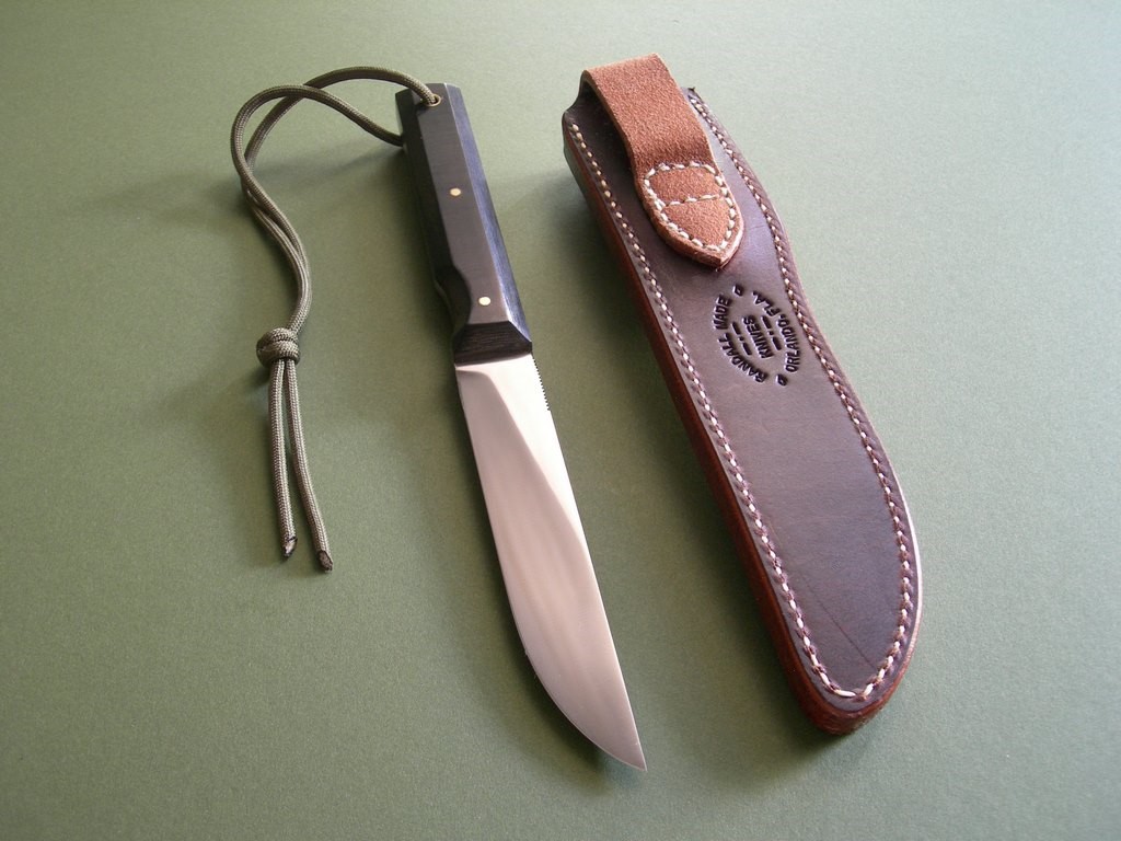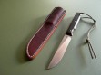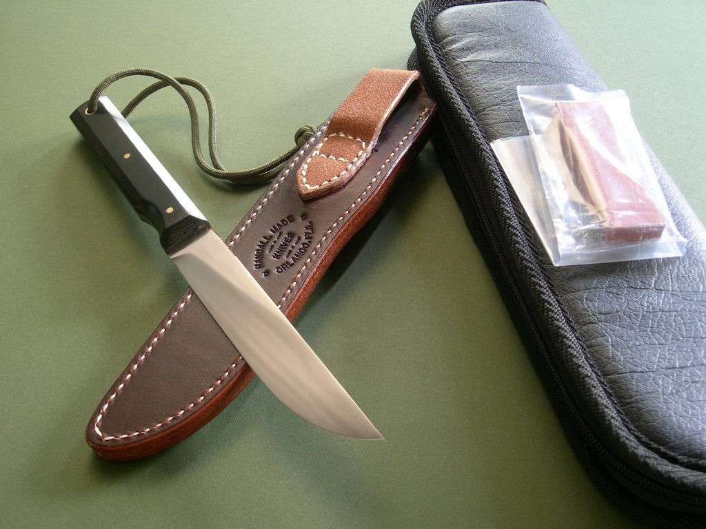 Summary: this is a brand new Randall model #10 with a 5" blade that’s notched on top for thumb placement. Standard build with black micarta scales, mint condition with factory grease just removed prior to taking photos. The knife is paired to a brown Sullivan model E cover sheath with the RMK stamp on the back. Mint condition.