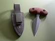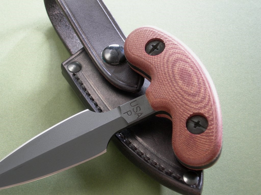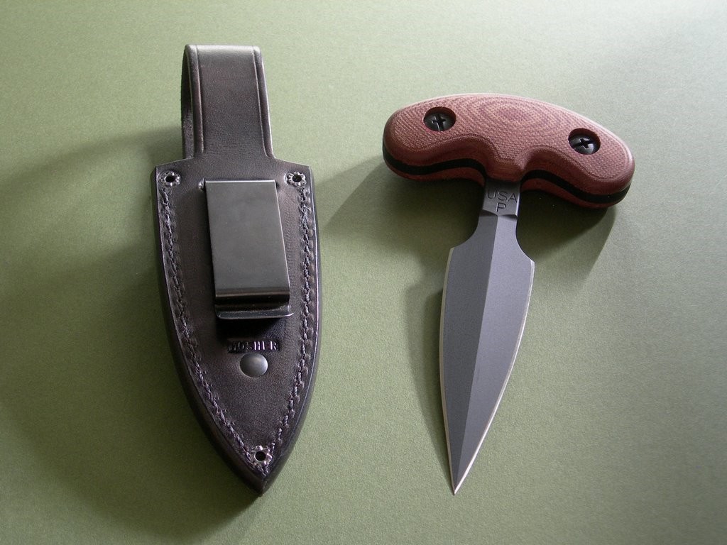Summary: this is a 2nd Generation prototype Treeman push dagger in mint condition. Red micarta handle, overall length is 6”. It’s paired to custom Mosher-made black belt / boot sheath with over the handle keeper strap. Great sheath, fit and finish is exceptional.