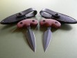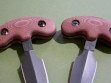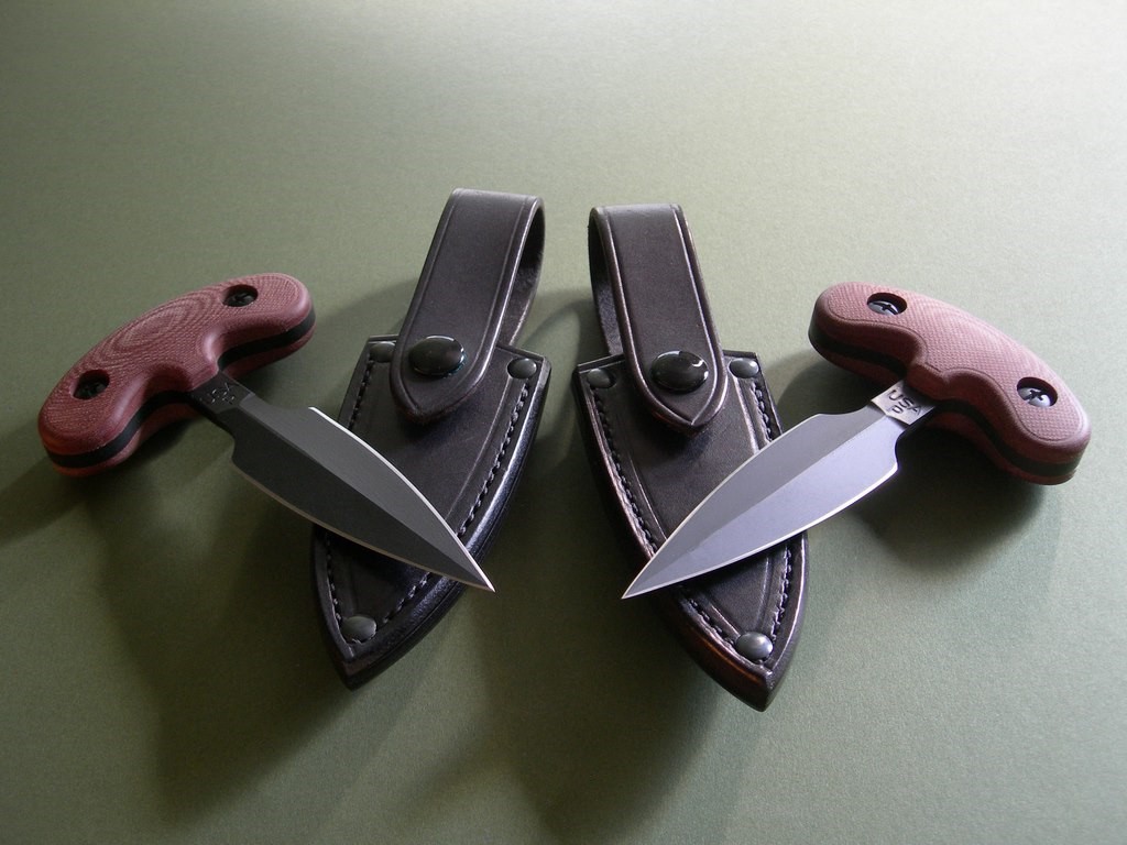 Summary: these are 2nd Generation prototype Treeman push daggers in mint condition. Red micarta handles, overall length is 6”. Both paired to custom Mosher-made black belt / boot sheath with over the handle keeper strap. Great sheath, fit and finish is exceptional.