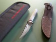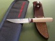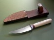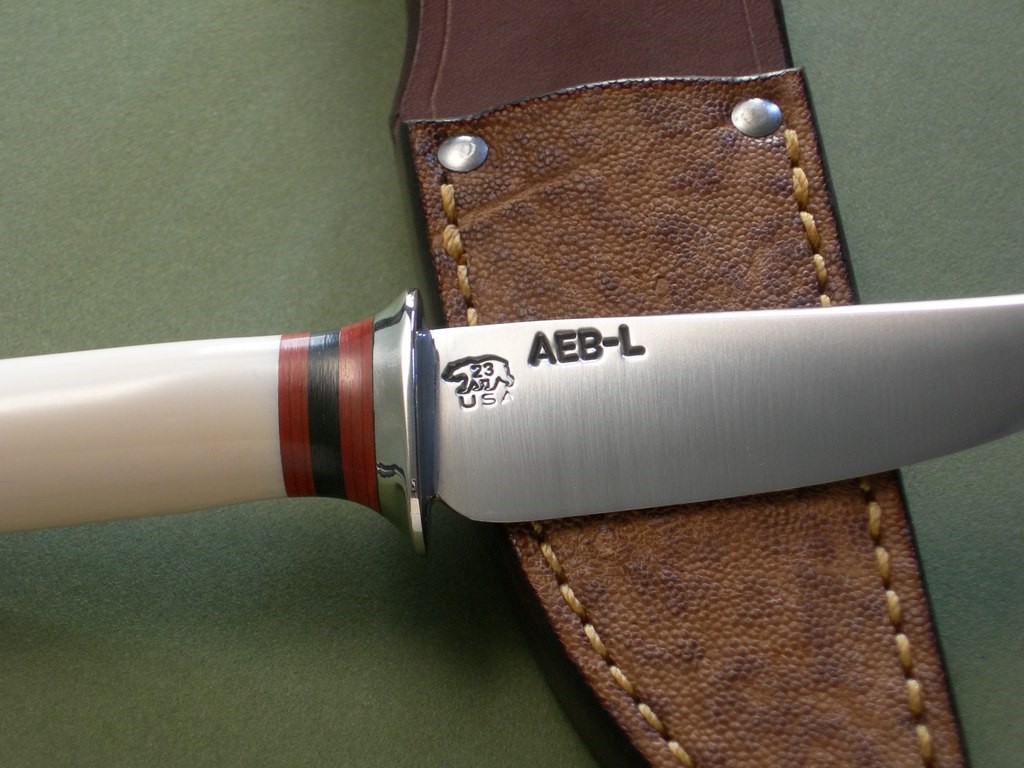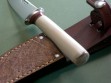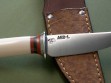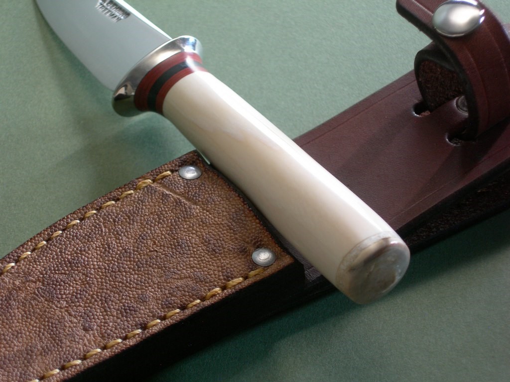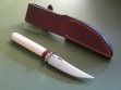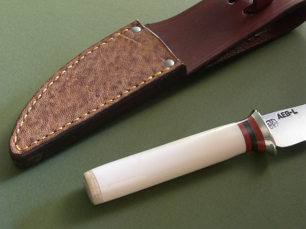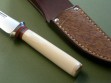 Summary: one of Jim’s small mammoth ivory AEBL stainless steel creations. This is a sweet little trout knife with a 3.5” SS blade, nickel silver guard, short spacer stack with creamy mammoth handle and darker mammoth butt cap. Overall length is 7-3/8”, perfect size for bird hunting and fishing. Paired with a custom Elephant ear front panel belt sheath, both the knife and sheath are in mint condition.