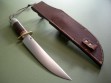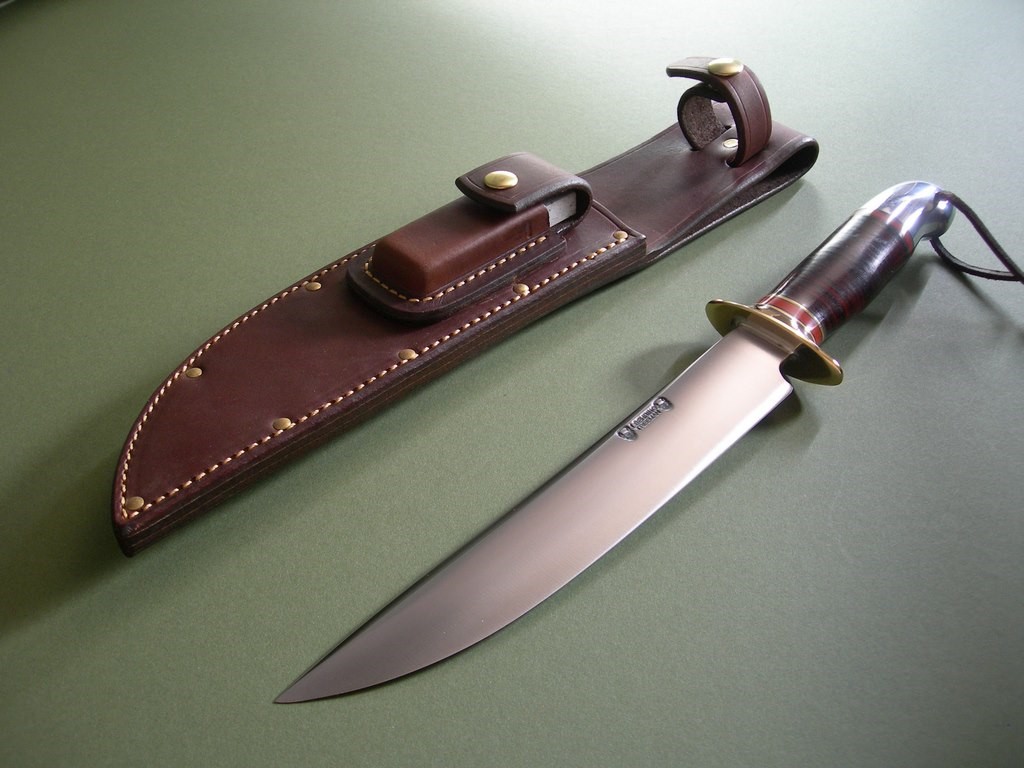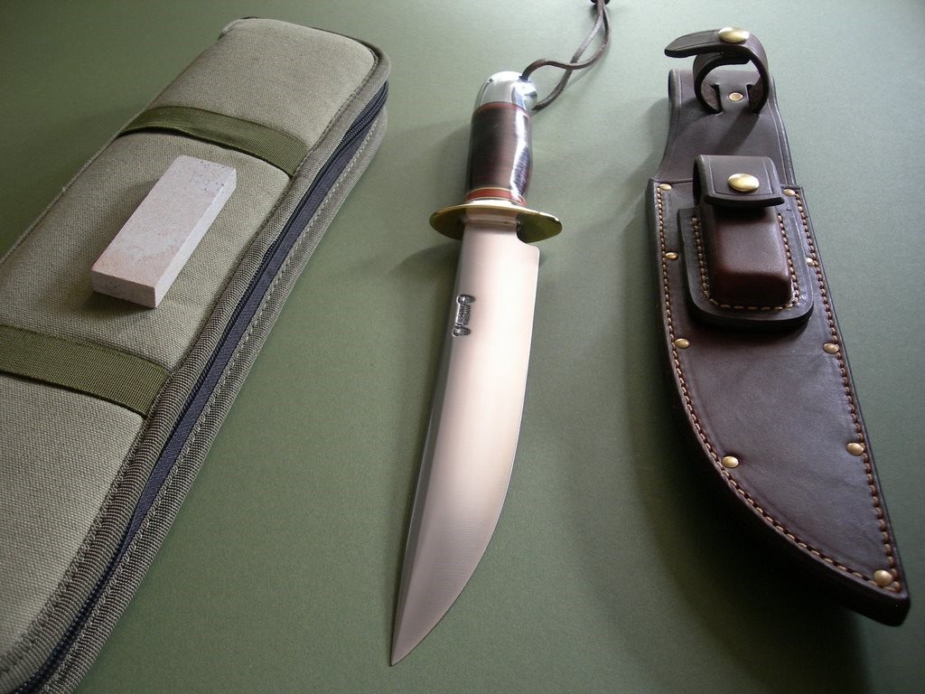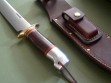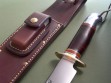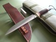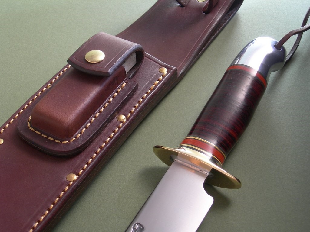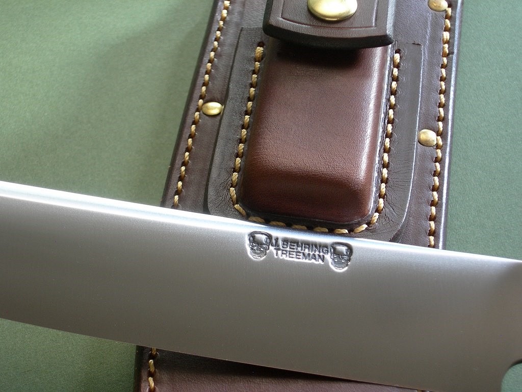 The custom riveted stone pocket sheath is a thing of beauty and has the thigh lanyard loop on the back. Large white sharpening stone in the front pouch, good fit and doesn’t rattle around. The sheath in mint condition, Treeman Leather Shop stamp on the back.