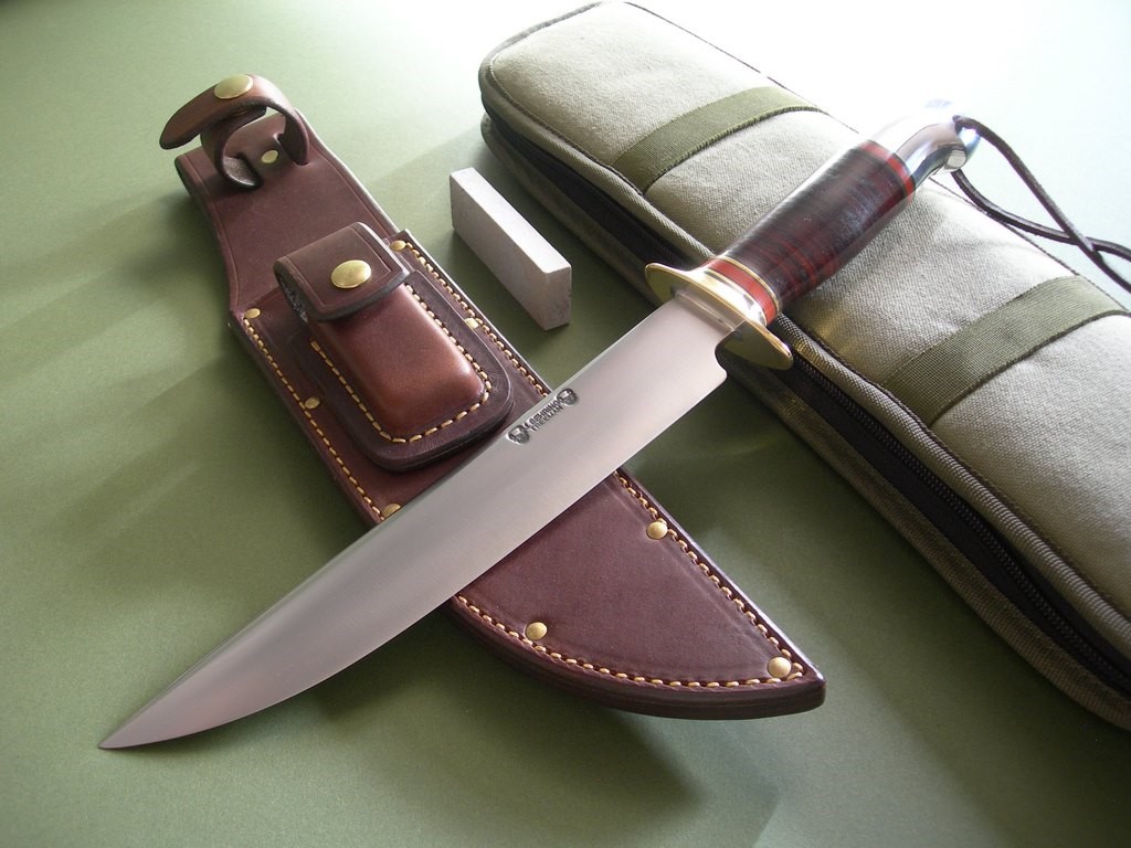 8 photos for review – as shown, a green canvas carry case is included. This is a fabulous knife / sheath package, a great one to buy if you’re looking for something special to add to your fighting knife collection. The blade grind reminds me of one of the very early RMK fighters, photos are decent but it’s much nicer in hand / in person. Thanks and good luck.