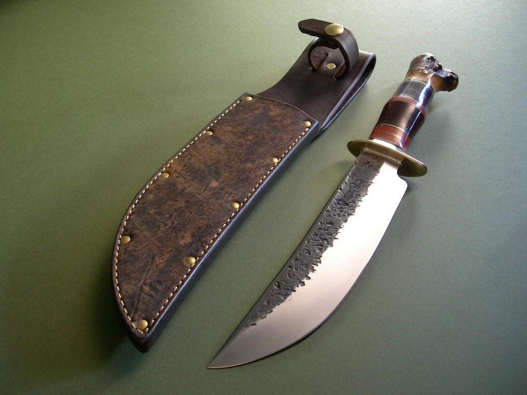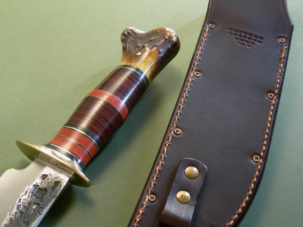 The knife is fitted to a custom riveted sheath made at the Treeman shop. Treeman Leather Shop stamp on the back, a really sweet Giraffe front panel and even comes with a riveted loop for a thigh lanyard. Brand new, just a rub or two at most.